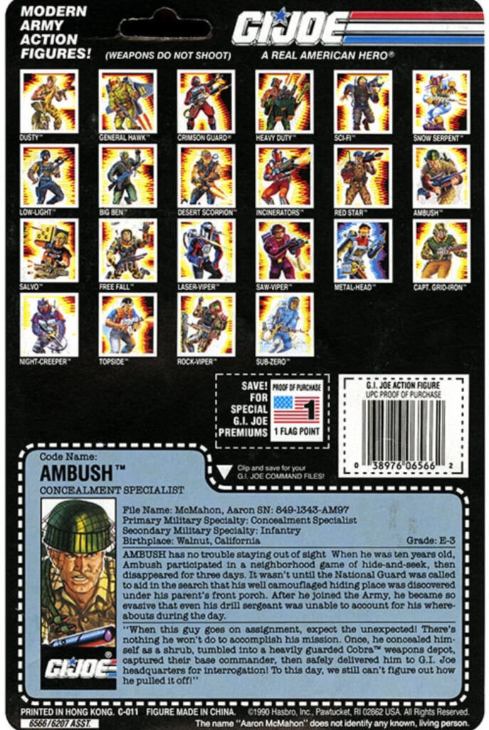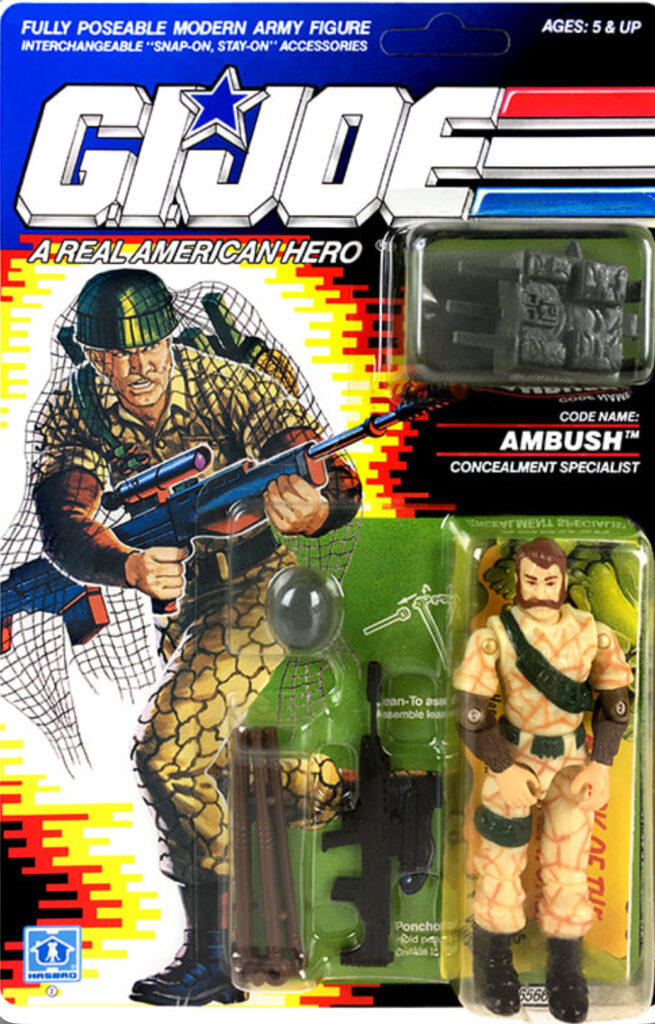 Welcome to The Outpost. Today I’m dialing it back to 1990. I was entering high school and my G.I. Joe days were slowly fading away. I think my mom still felt bad for years we didn’t get much for Christmas or maybe she was just hanging on to her little boy. Either way this was the last year I would receive GI Joes for Christmas. It was only a handful of figures and one I received is a fan favorite. Ambush was a really cool looking figure. Aaron McMahon from Walnut, Ca. Ambush is an infantryman whose specialty is hiding out. He did have a part in the cartoon and the comics, so this was an easy character to become very popular.