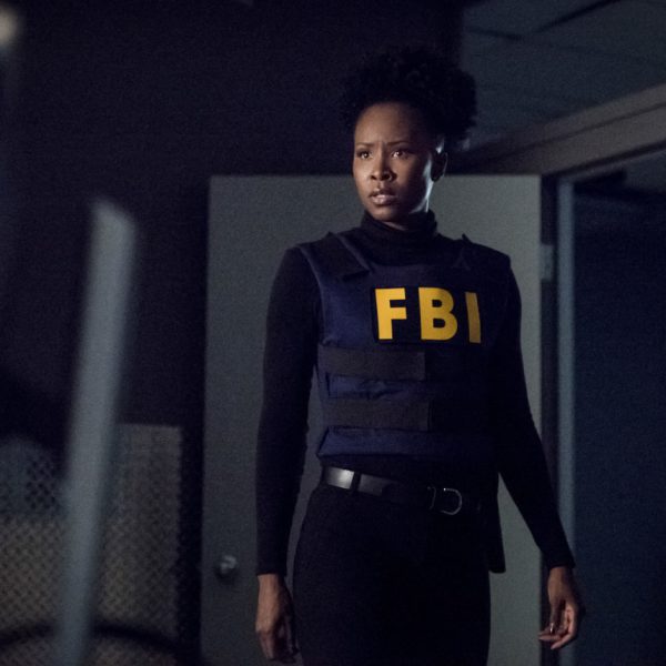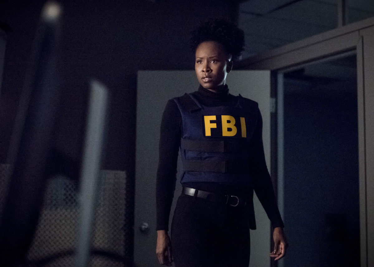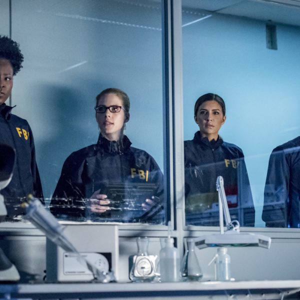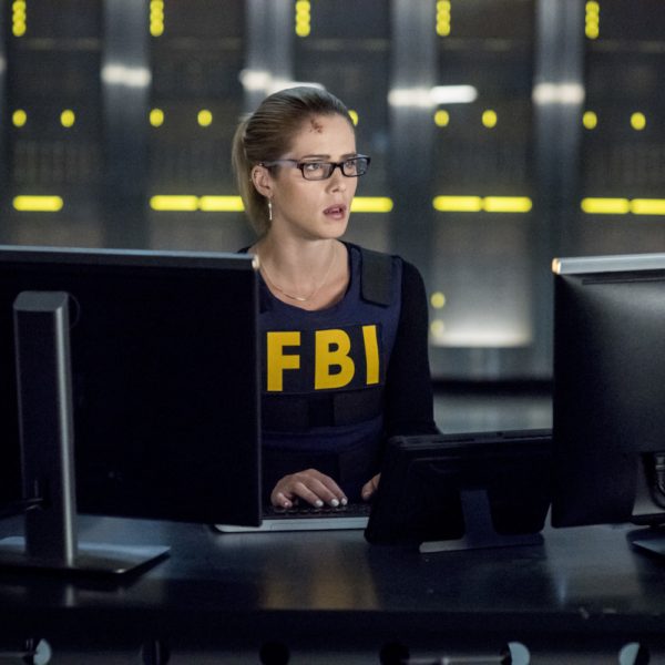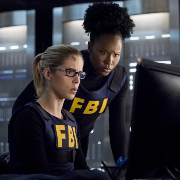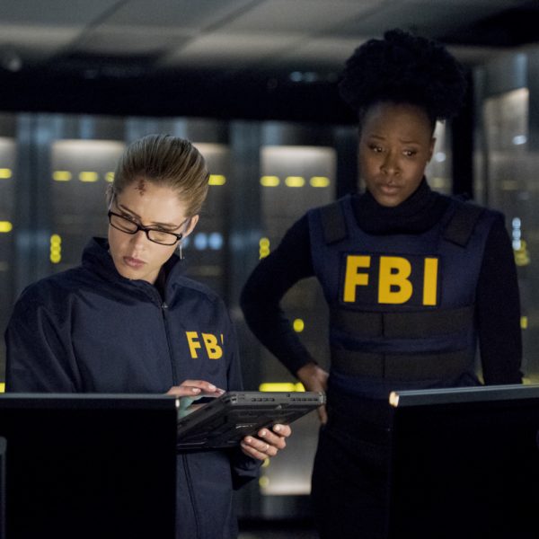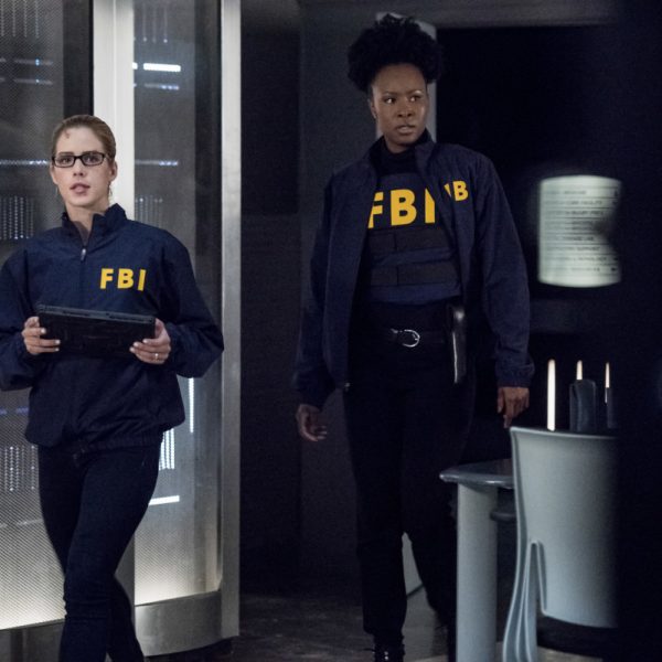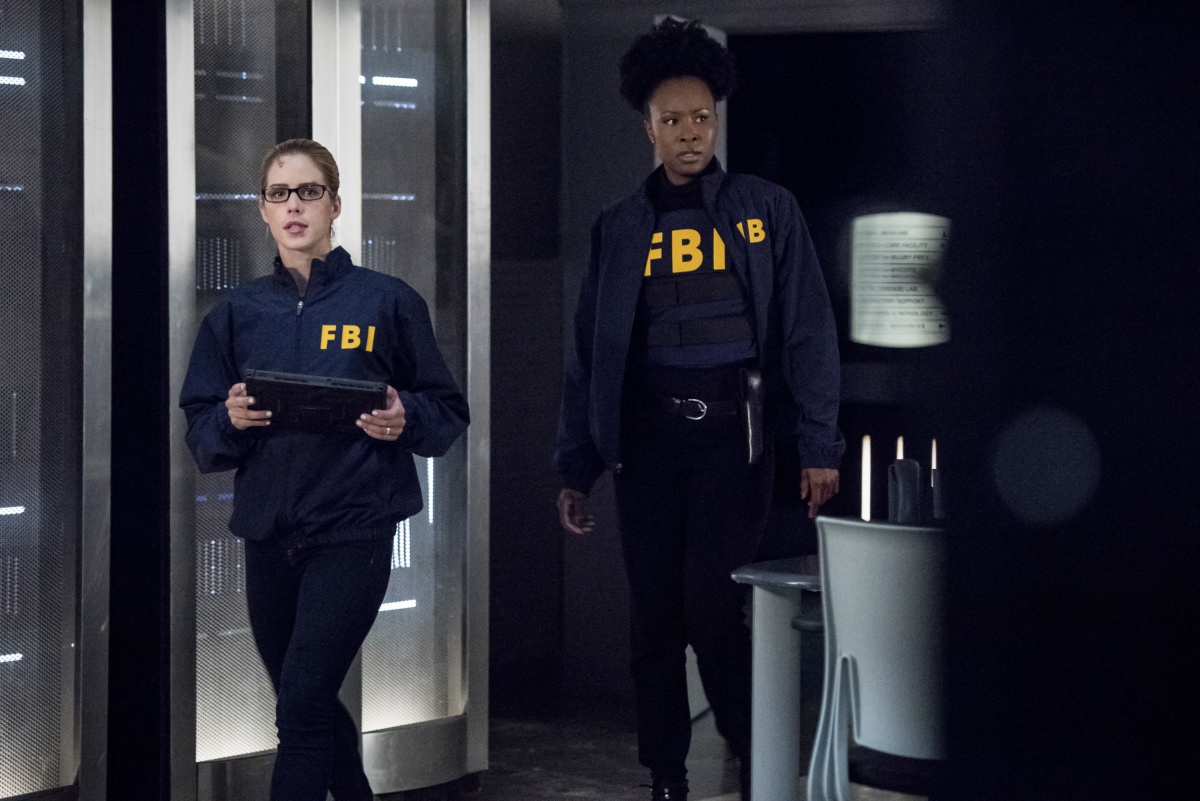 Arrow — “Crossing Lines” — Image Number: AR703b_0234b — Pictured (L-R): Emily Bett Rickards as Felicity Smoak and Sydelle Noel as FBI Agent Samanda Watson — Photo: Dean Buscher/The CW — © 2018 The CW Network, LLC. All Rights Reserved.