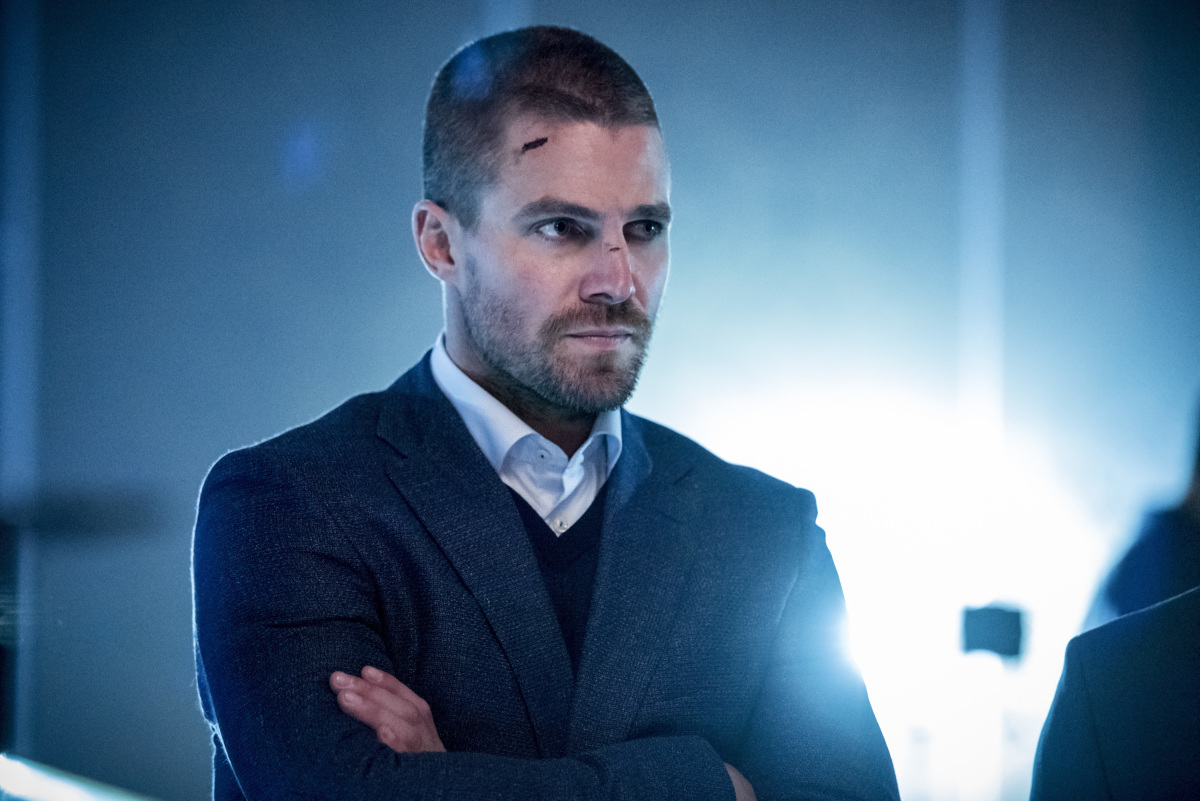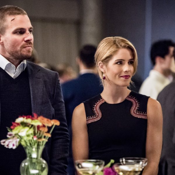 Arrow — “Unmasked” — Image Number: AR708a_0398b — Pictured (L-R): Stephen Amell as Oliver Queen/Green Arrow and Emily Bett Rickards as Felicity Smoak — Photo: Dean Buscher/The CW — © 2018 The CW Network, LLC. All Rights Reserved.