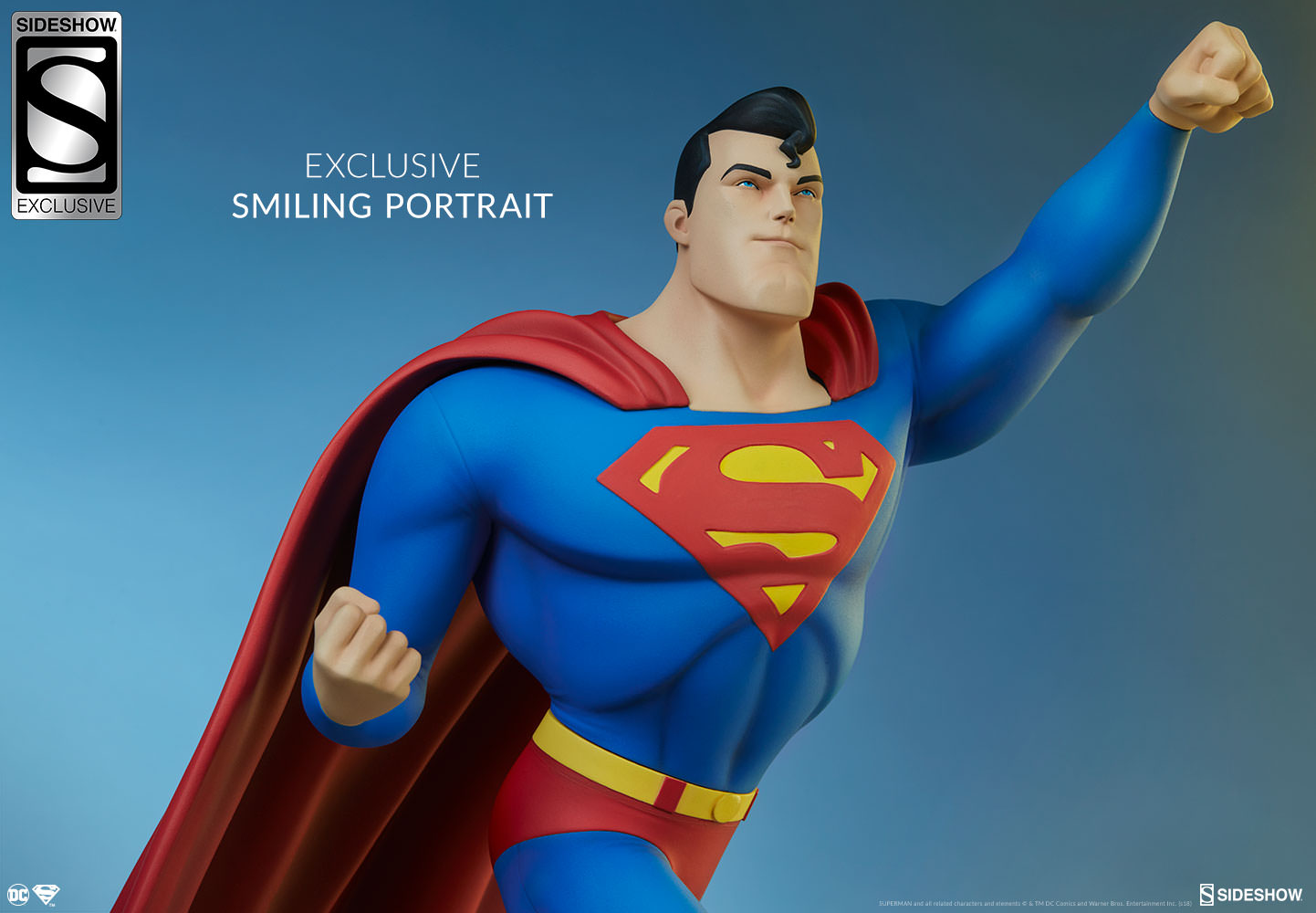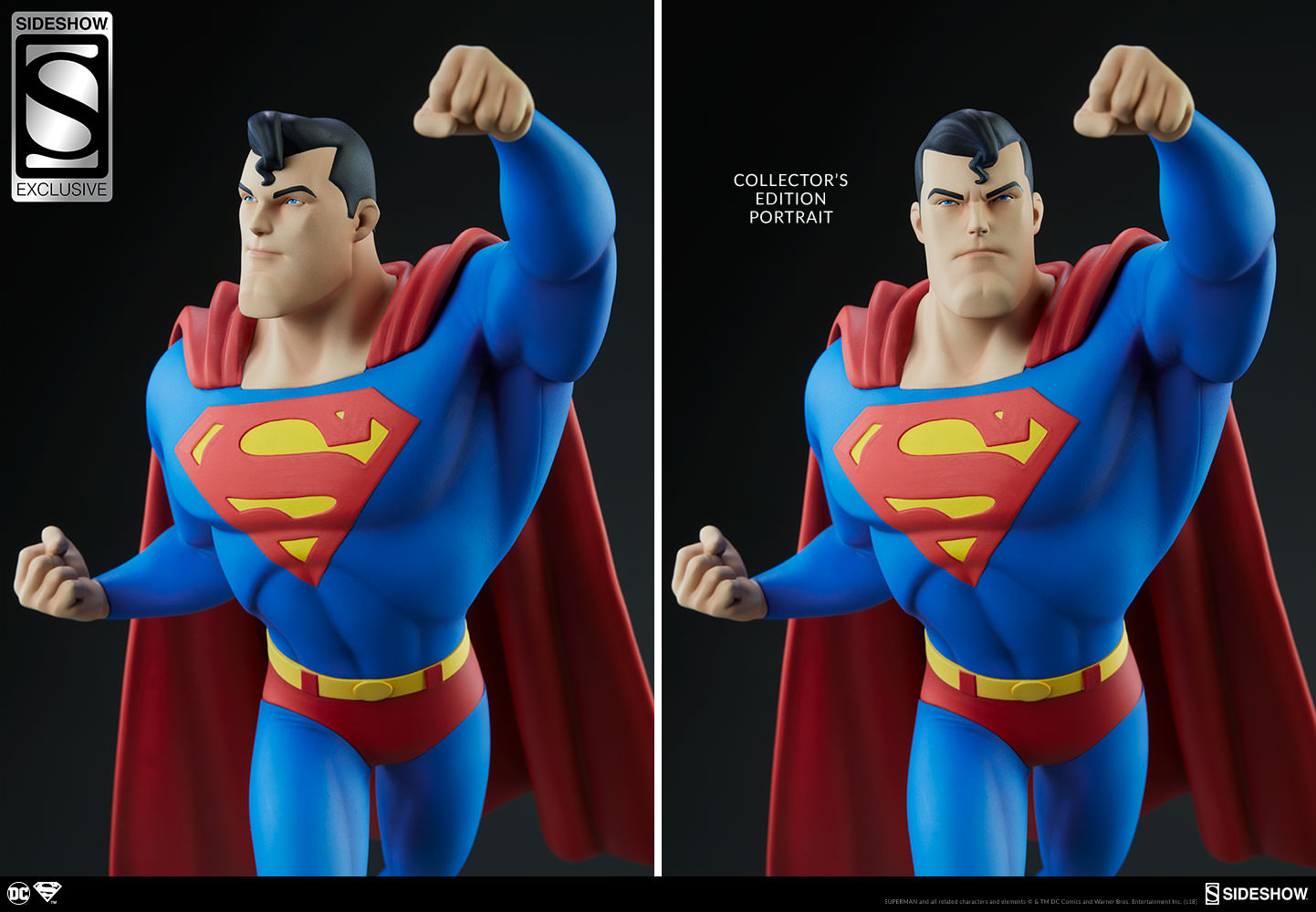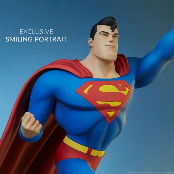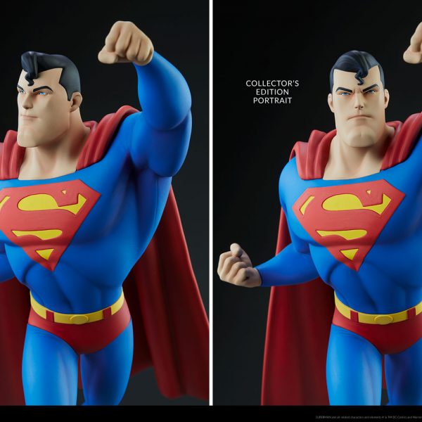 The Exclusive Edition of the Superman Statue includes an alternate portrait with a smiling expression, giving you an additional display option for this animated Superman collectible.