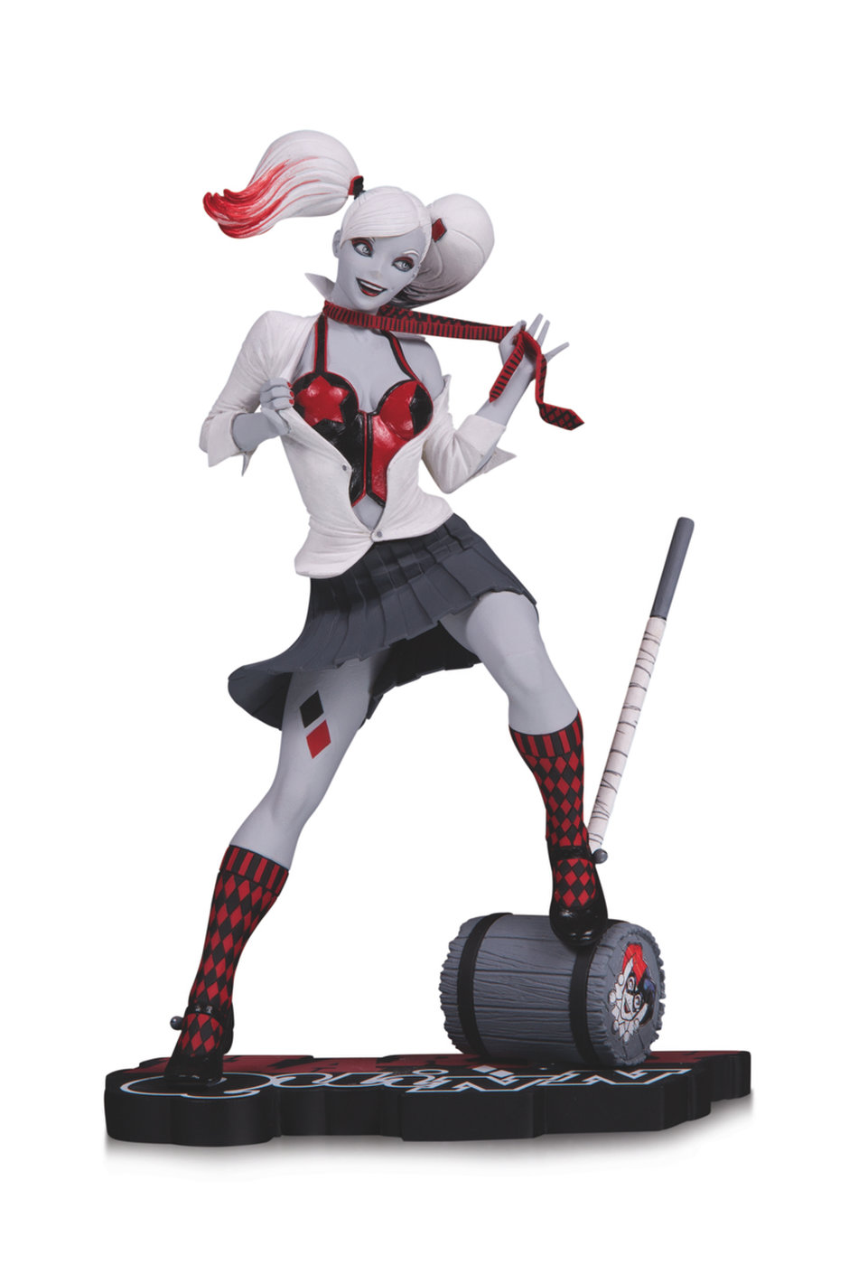 Crafted from the artwork of Guillem March, a multifaceted artist who has produced multiple covers for Harley Quinn comics, the newest entry in the HARLEY QUINN RED, WHITE & BLACK statue line brings a playful, minimalist-tone to the Maid of Mischief. Yet with the detailed design and splashes of color, this figure remains unmistakably Harley.