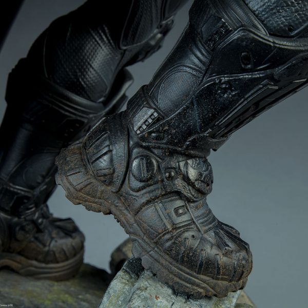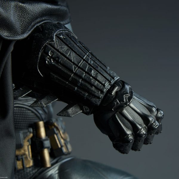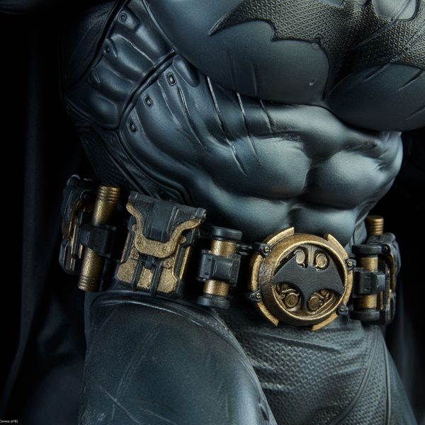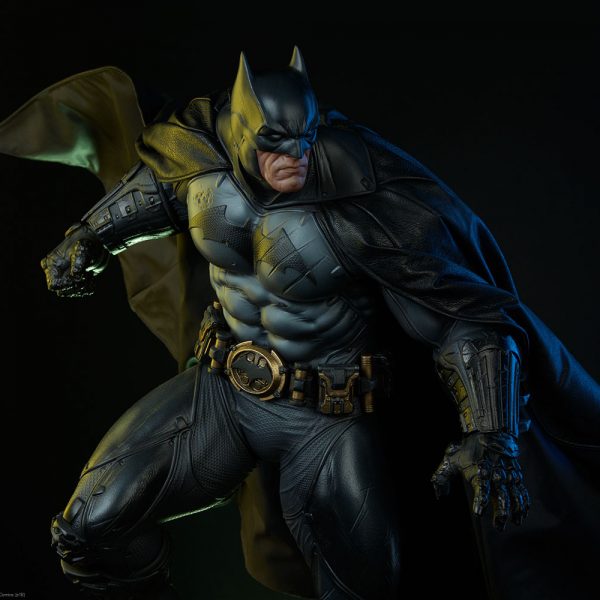 The Batman Premium Format™ Figure stands ready to bring justice to his city, wearing an updated version of his iconic costume. The polyresin figure has a sculpted black and grey tactical bodysuit featuring a gold utility belt. Batman’s chest, gauntlets, and boots textured with elements of battle-damage.