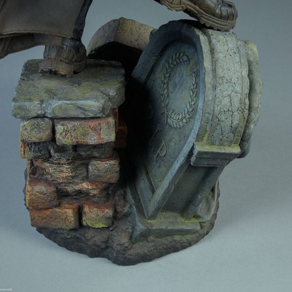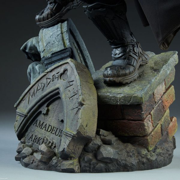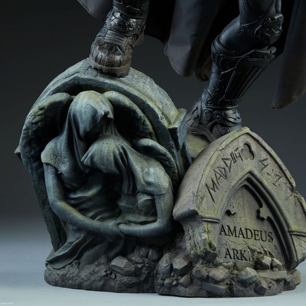 Batman measures 21” tall, perched atop an Arkham cemetery base. Fans familiar with the shaded history of Gotham’s famed asylum may recognize the marks of madness carved into the gravestones beneath Batman’s boots.