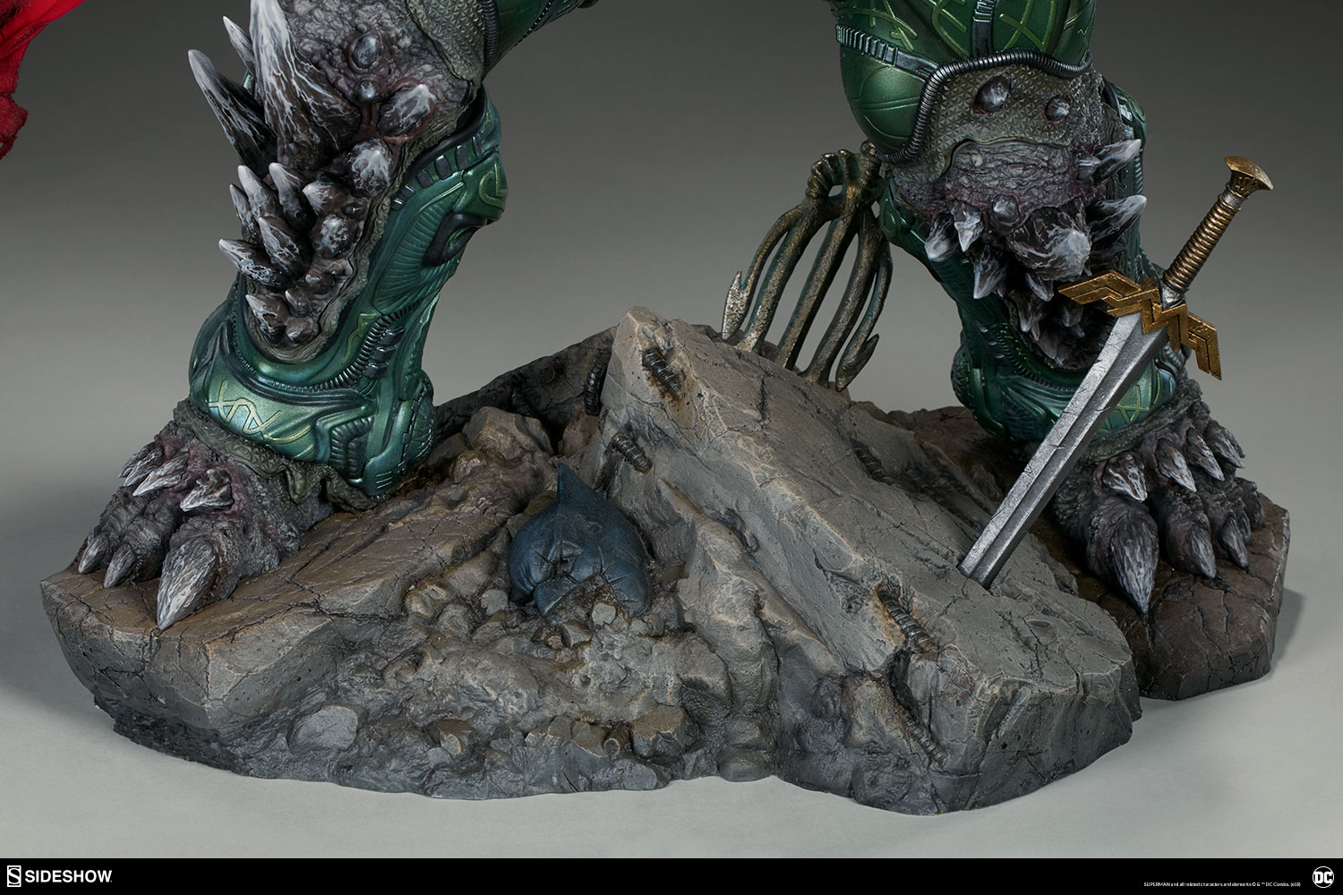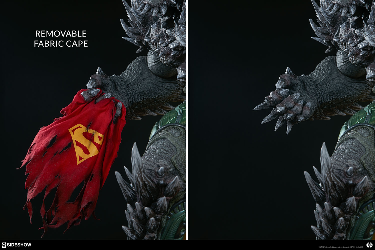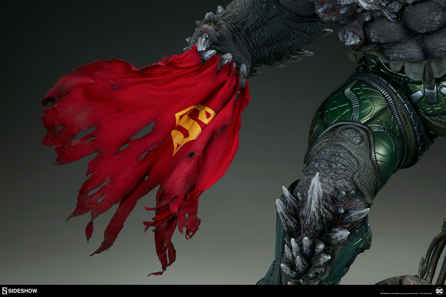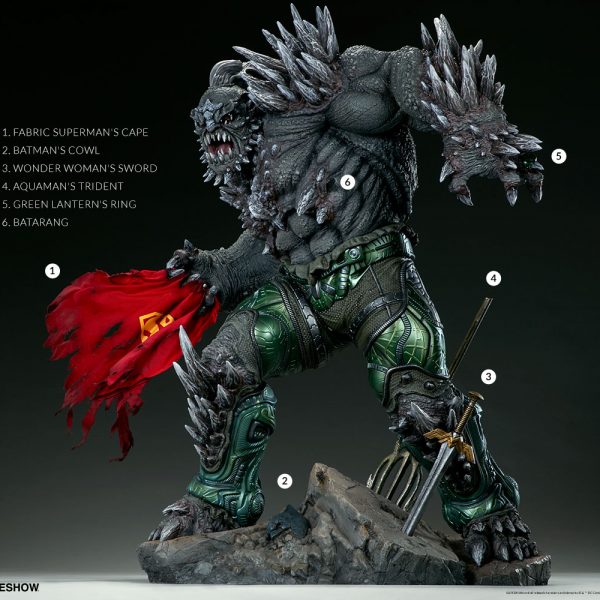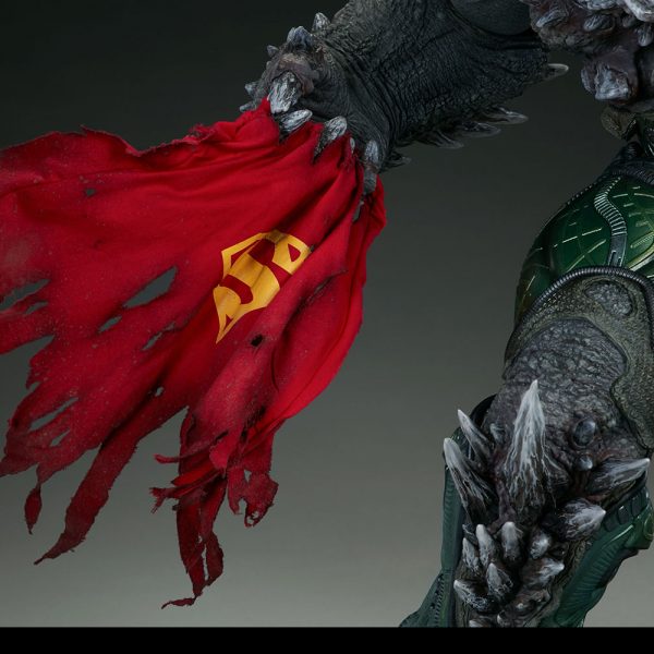 Wonder Woman’s sword, Aquaman’s trident, and Batman’s cowl all serve as trophies at Doomsday’s feet while a number of Batarangs are embedded into his chest and shoulders. In his right hand he clutches the fabric tatters of Superman’s cape, which includes internal wiring for posing and can be removed from the figure. On his left hand, the villain has forced an inert Green Lantern ring onto his finger in a brutal display of force.