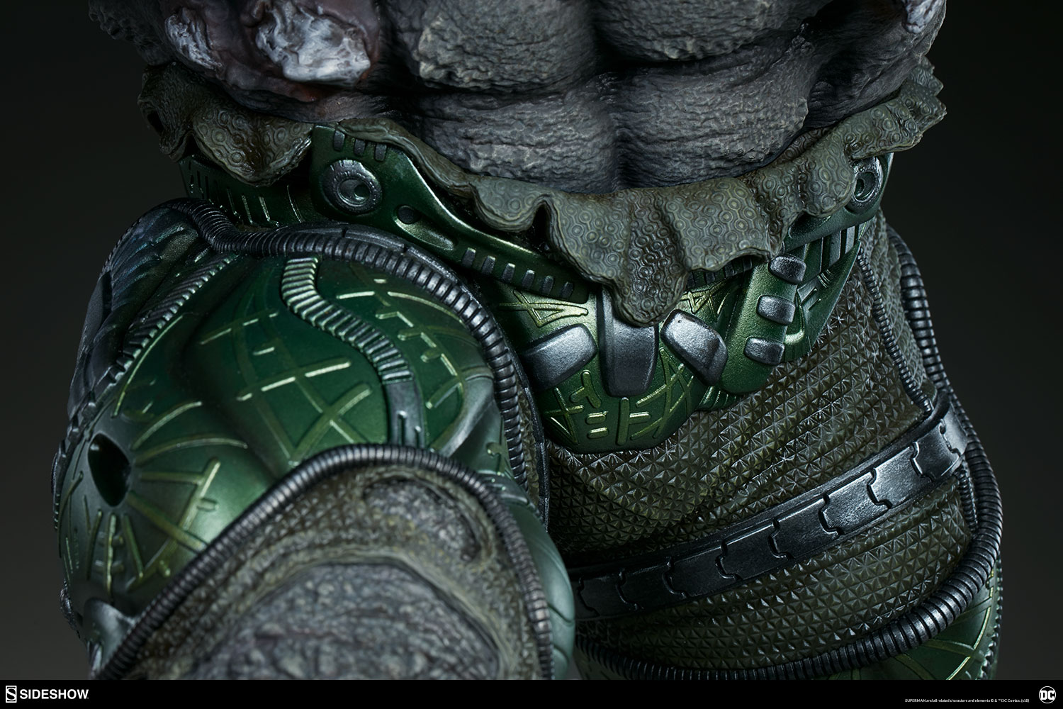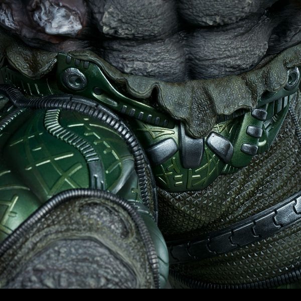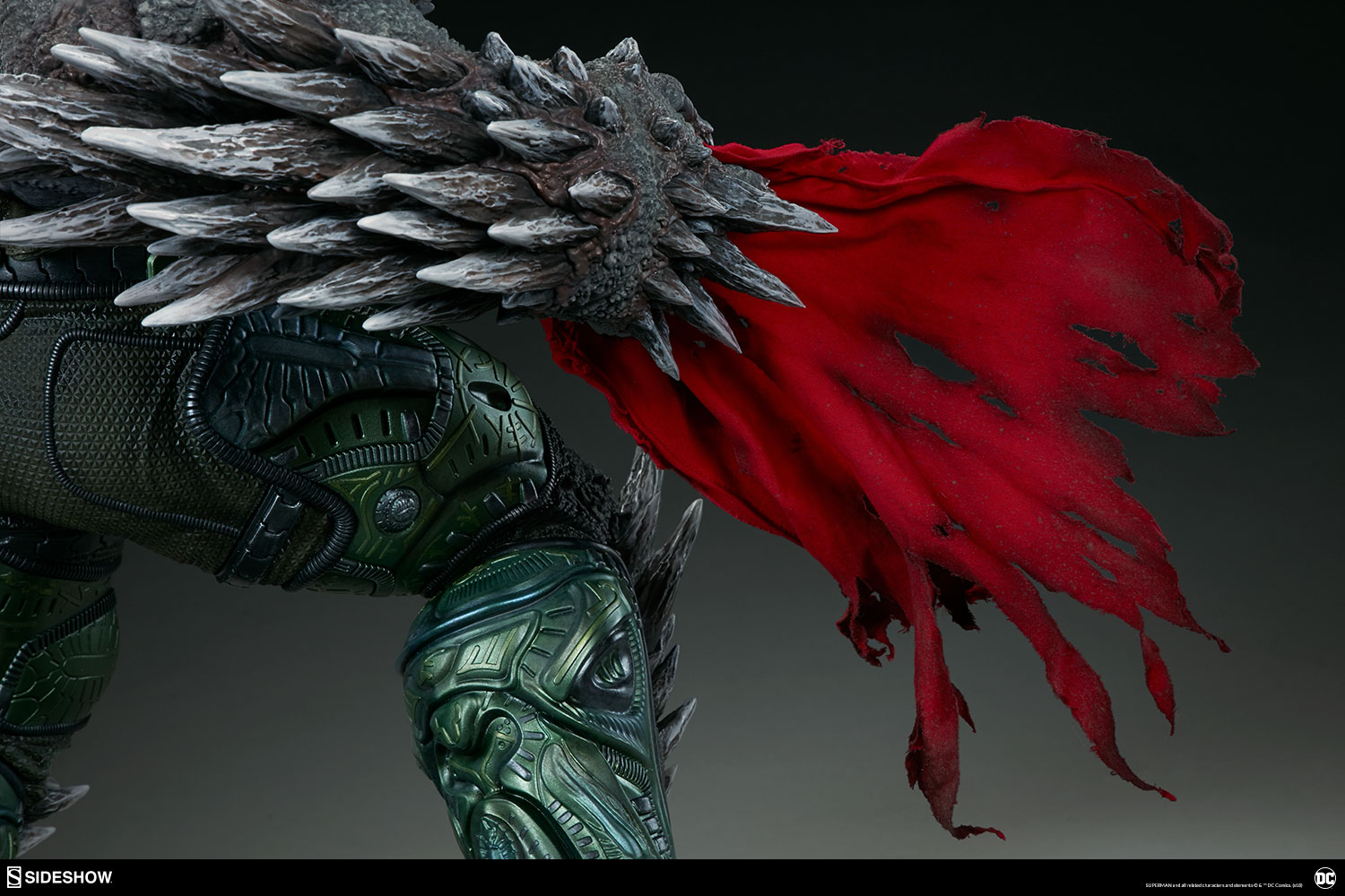 The Exclusive edition of the Doomsday Maquette includes a swap-out hooded portrait, inspired by his debut in the Superman comics. The sculpted green hood is detailed with complex textures and a red eye lens, as Doomsday tears through the containment mask to unleash his full power.
