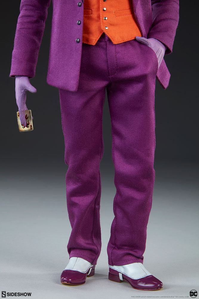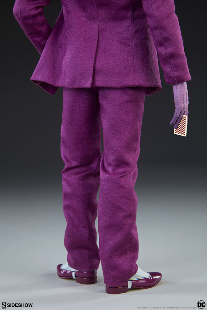 The Joker Sixth Scale Figure features an intricately-tailored fabric costume that includes a purple suit jacket and pants, an orange vest, a black dress shirt, and a green bow tie. He has a sculpted lapel flower, shoes with sculpted spats, and ten different gloved hands including a pair of grip hands, a pair of fists, a pair of card-holding hands, and additional hands for pointing, holding his cane and gun, and a hand with a gag buzzer.