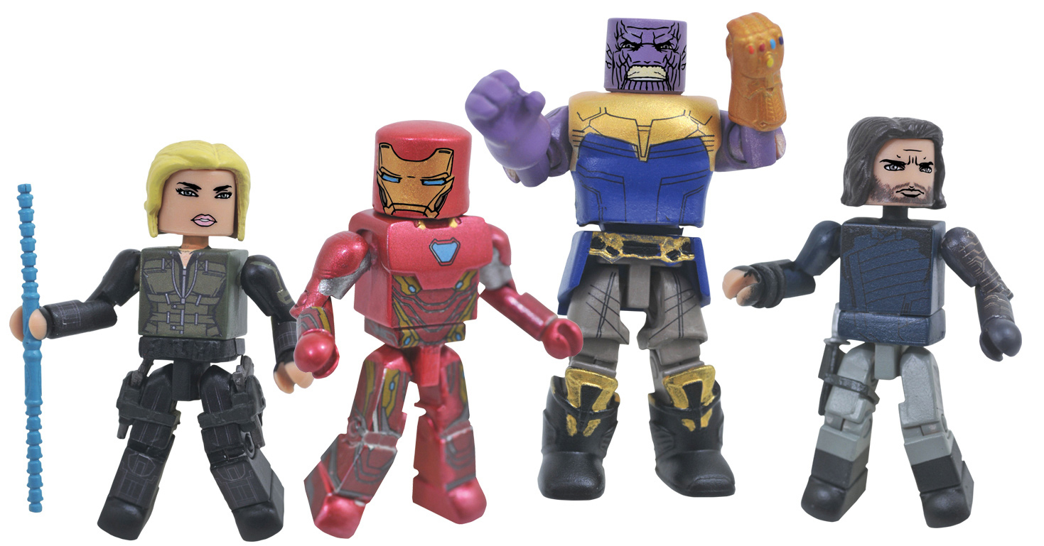 A Diamond Select Toys release! This all-new box set features Iron Man in his Mark 50 armor, Thanos with his Infinity Gauntlet, and two exclusive characters – Black Widow and the Winter Soldier! Each Minimates mini-figures measures approximately 2 inches tall with 14 points of articulation, as well as fully interchangeable parts and accessories and a display stand. Packaged in a full color window box. Designed by Barry Bradfield!