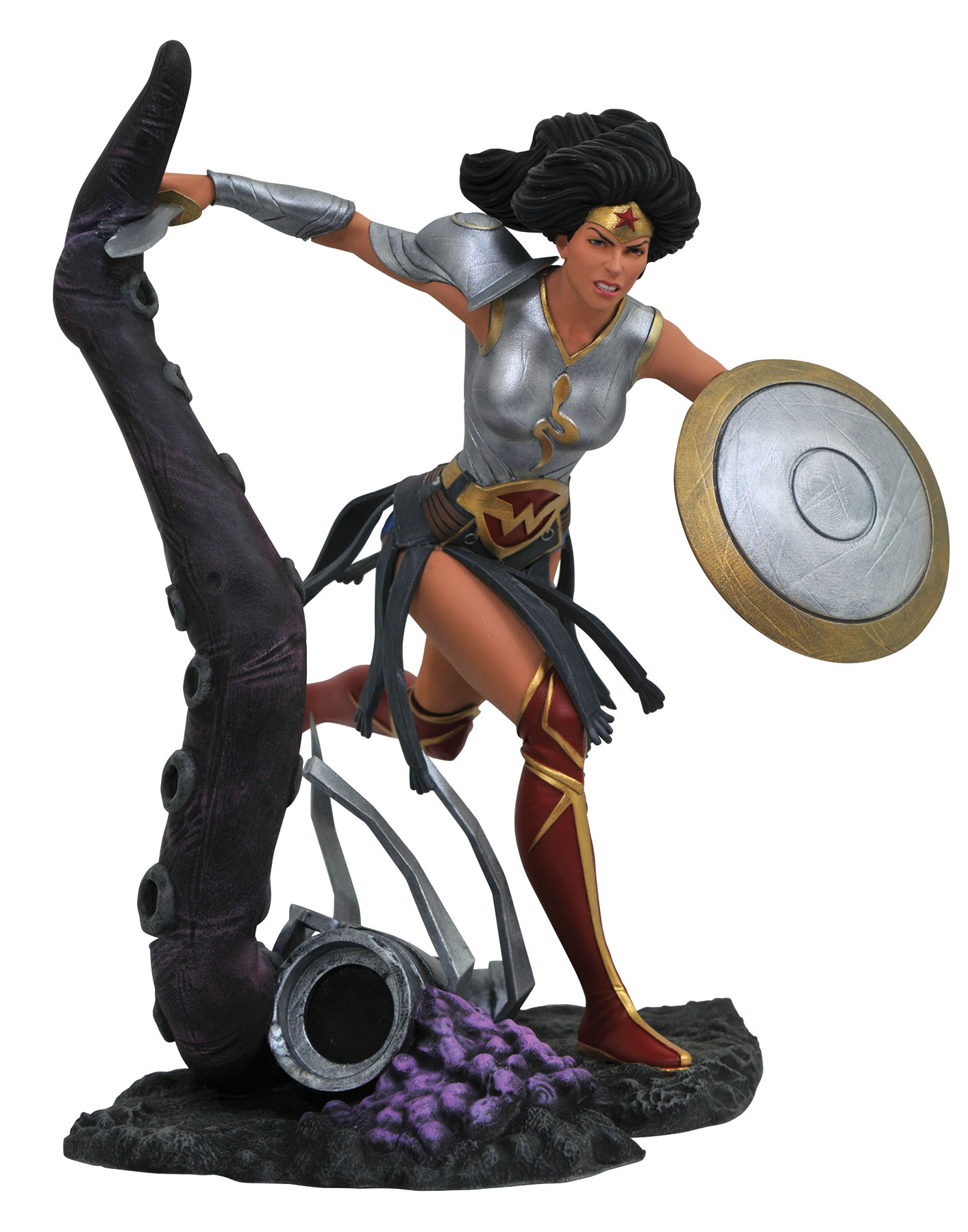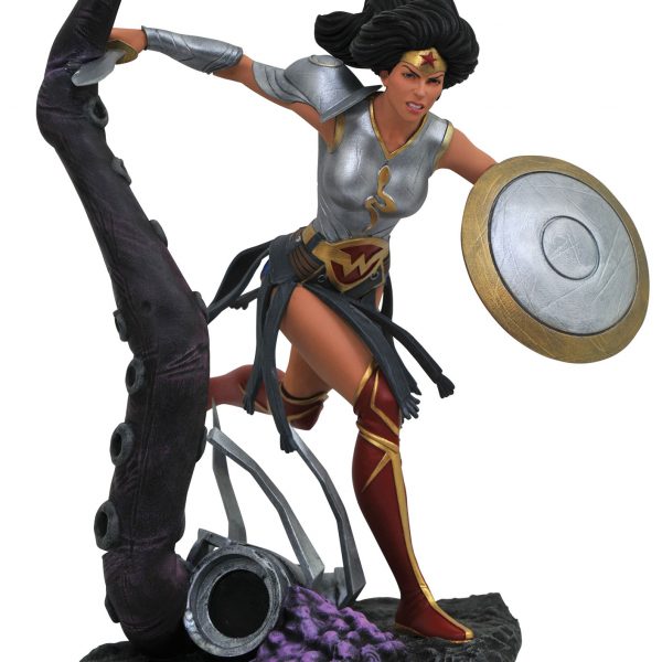 How metal is your Gallery? The world of Dark Knights: Metal expands with the latest comic-based DC Gallery diorama – Wonder Woman from the world of Batman: The Merciless! This woman warrior is girded for battle with breastplate and shoulder armor, and has her sword and shield at the ready. Sprinting past a monstrous tentacle, this action-packed 9-inch PVC diorama comes packaged in a full-color window box. Sculpted by Cortes Studio based on a design by Caesar!