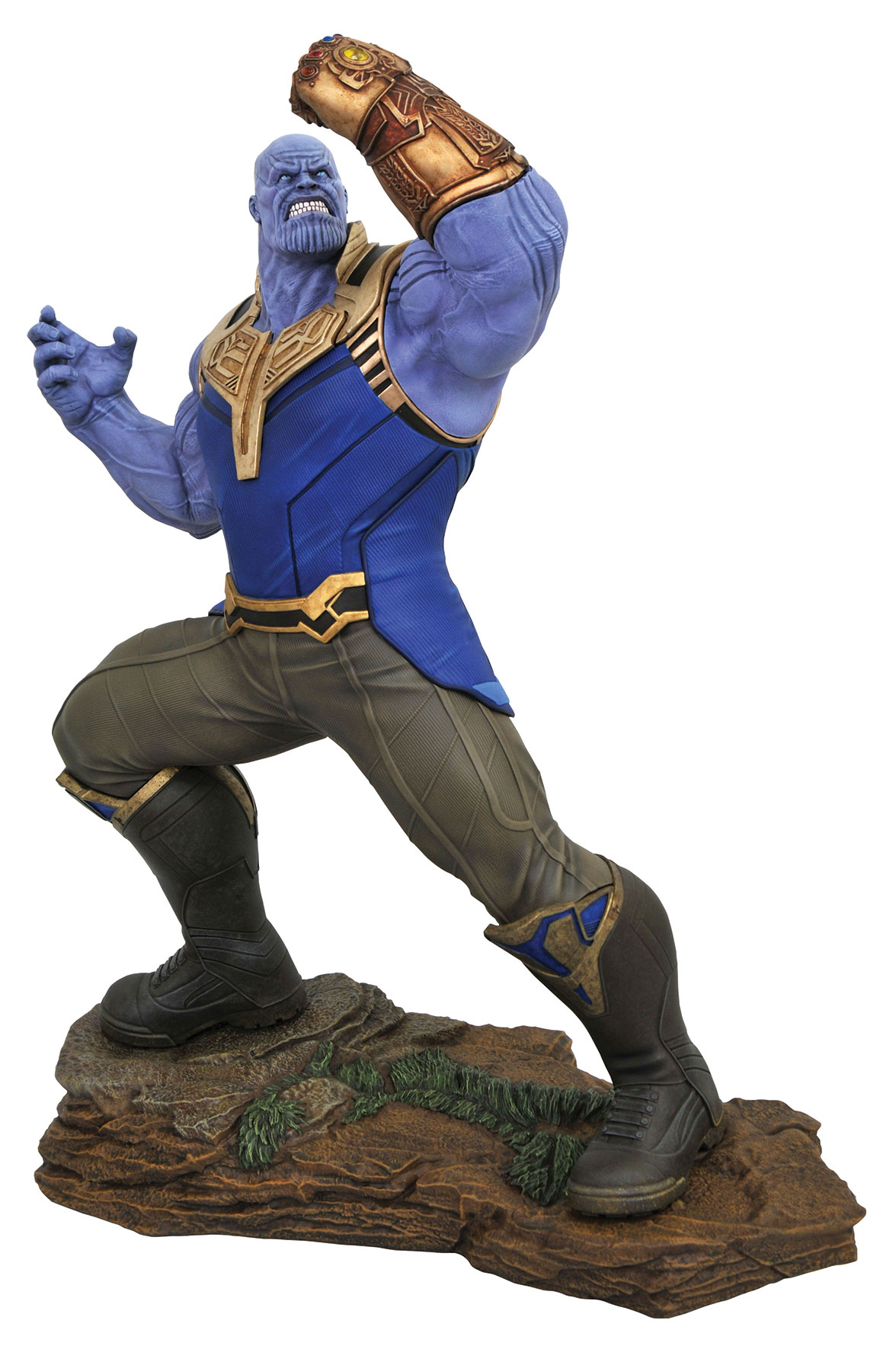 Thanos triumphant! The mad titan has collected all of the Infinity Gems, and raises his gauntlet in victory in this new statue in the Marvel Milestones line! In scale to other Milestones pieces, this 20″ sculpture can display with the Infinity War Thor statue or on his own, and is limited to a numbered edition of only 1,000. Snap him up before he snaps his fingers! Packaged with a certificate of authenticity in a full-color box. Designed by Joe Allard and sculpted by Jorge Santos Souza!
