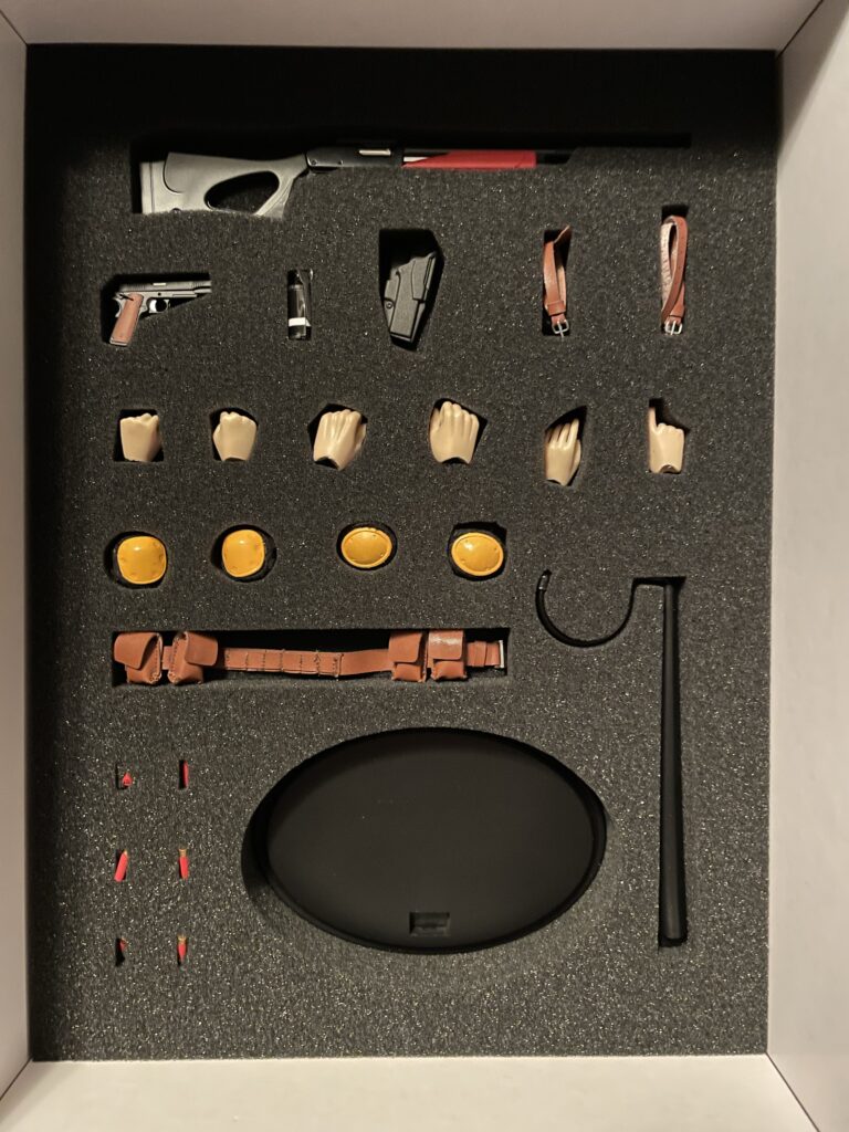 I’m not sure if it is intentional or I may be delusional about all the hype lately but I think she looks a bit like Taylor Swift. Into her accessories. There are knee and elbow pads which looks like BBK is giving a shout out to the 2010 3-3/4 version, this seems to be the only version of Scarlett I could find with knee pads. Cool but I may leave those off. She does have a nice utility belt with magnetic pouches so you can easily store ammo and supplies. She comes with a pistol and a cool shotgun that you can load the shells into. The only gripe I have is she did not come with her signature crossbow but this may be because they are outlawed these days. I thought about using a 6 inch Chewbacca rifle but, it didn’t look right. I did have a 1/6 scale crossbow with a large handle, but I think it works. Over all this is a really cool figure and I’m happy I was fortunate enough to pick her up. Make sure to check back for our next discussion.