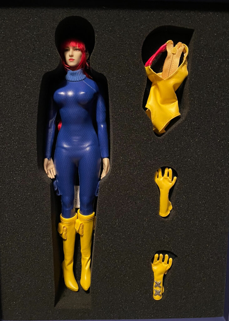 Opening her up reveals a Scarlett figure with a blue jump suit with a really cool modern design on it. The yellow 1 piece looks really cool but the zipper is a bit tight so I had to use some extra caution to make sure I didn’t break it. The end result look really cool though. Her boots are her signature high heels and there is not a bare foot that slides into the boot. They are a soft leather like upper with a solid plastic heel that snaps nicely into the leg and provides a sturdy stance with movement in all directions for posing. I could swap out for a bare foot if I ever did want to swap her uniform or boots for any reason. I did drop her jump suit down and the body is a soft rubber or plastic and the face is a hard plastic with red flowing hair.