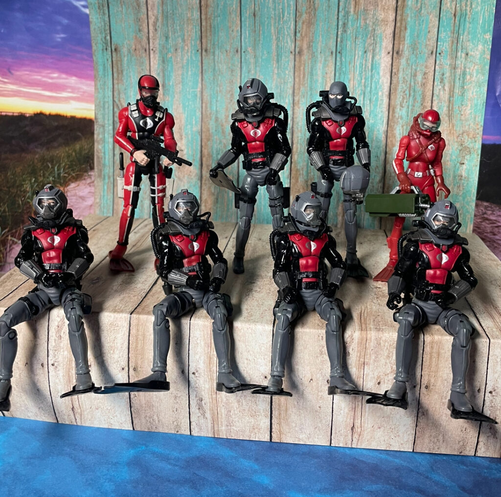 I think about how many hours of enjoyment someone had with this guy. He probably got tossed around, jumped into the toilet, and maybe even tried to fly over the moon, but he survived, well some of him survived and he is one tough soldier. Over the years the Eel stood strong and there was a couple updates in 1992 and 1993. I do have one each of these and they are really cool. The 1992 version has one of the coolest projectile weapons that is a shark. This would have been a cool figure to use in the cartoon and having several of these sharks to do his dirty work. Mine is missing the tail fin but is still really cool. In 2008 the 25th style Eel was a masterpiece. This is one of my all time favorite figures from all of the Joe lines. The original look plus a removable helmet and all the rest of his gear was one look I loved. I’m happy they put this guy on a single card and I was able to troop build him. There were several modern figures that were all the 2008 figure repainted.