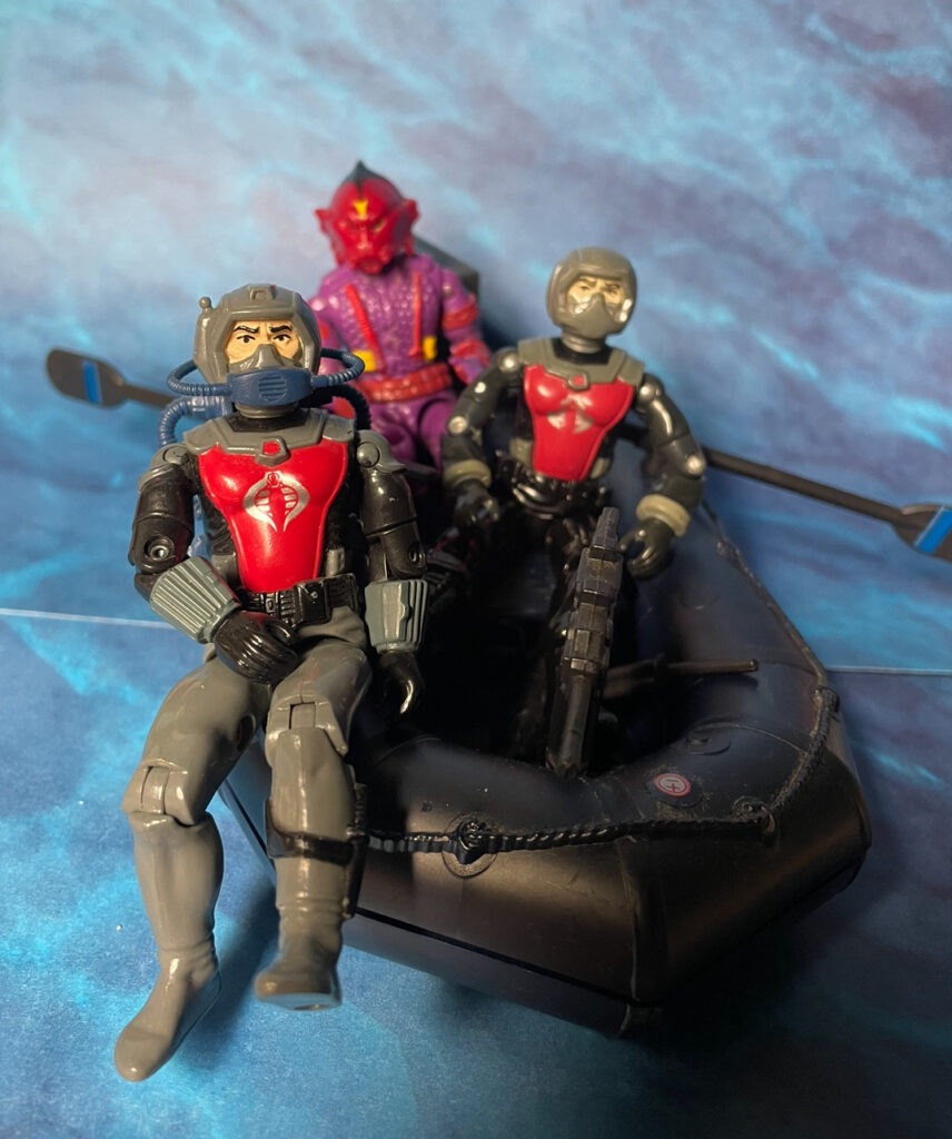 Welcome to The Outpost. Today I’m taking a look at the G.I. Joe Cobra Eel. One thing is for sure whether you are an old school Joe fan, a new fan, or middle of the road fan, the 1980s Joes were all pretty awesome. One of the coolest figures in 1985 was the Cobra Eel. We already had Torpedo from 1994 and we would soon get Wet-Suit in 1986, so having the Eel was perfect for the underwater battles. I did not have an Eel as a kid but I remember dreaming of him. I had the battle pack that came with blue swim fins, pack, and spear gun from the 1988 Cobra Battle Gear accessories pack. I still have those today and display that on my Eel. I also have a very rough looking Eel that would be what mine would look like today if I had him back in 1985 and still had him today. I like minty figures, but on the other a beat up figure holds a lot of value in my book.