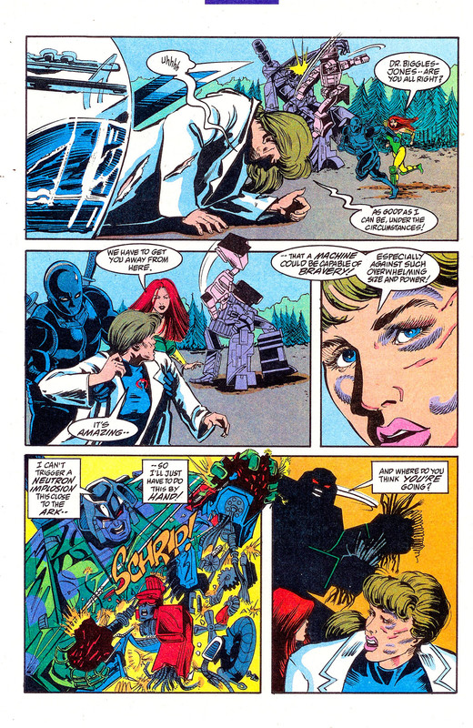 The story picks up just as Megatron is about to squash Scarlett like a bug, because she is trying to prevent him from “coring and freezing” Dr. Biggles Jones for a trip back to Cybertron. But fortunately at the last minute Optimus Prime and the Autobots arrive in Millville and all hell breaks loose!