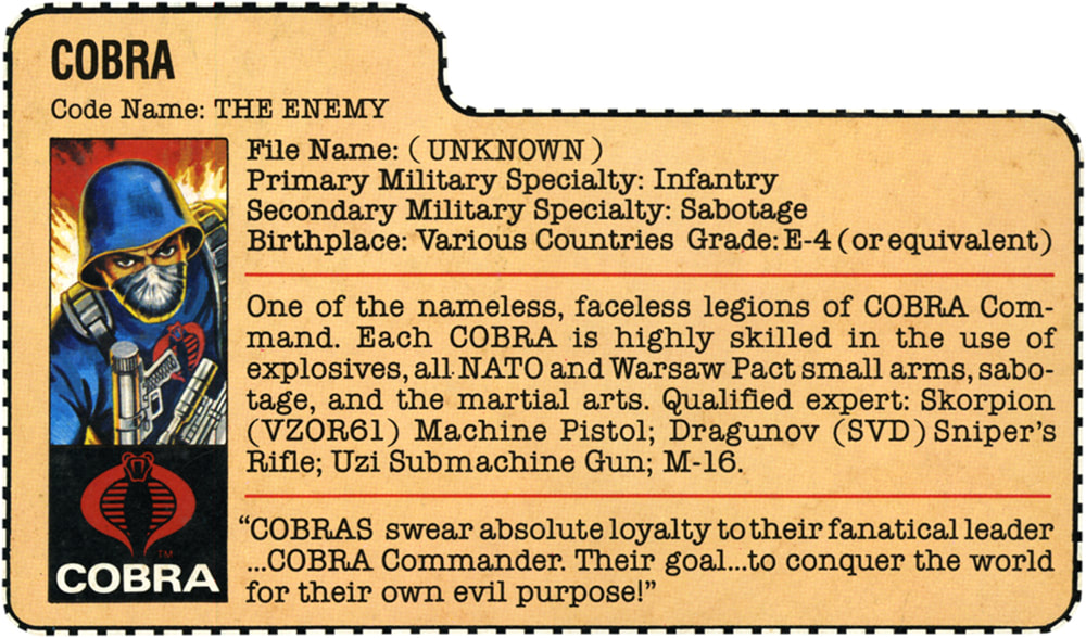 Originally just referred to as “Cobra” with a codename of “The Enemy” they have evolved to be referred to as “Cobra Troopers“. Their original filecard states they have a PMS of “Infantry” and a SMS of “Sabotage”. They are skilled in the use of explosives, all NATO and Warsaw Pact small arms, sabotage, and martial arts. Cobra Troopers are qualified experts in the Skorpion VZOR61, M-16, Dragunov sniper rifle, and the Uzi.