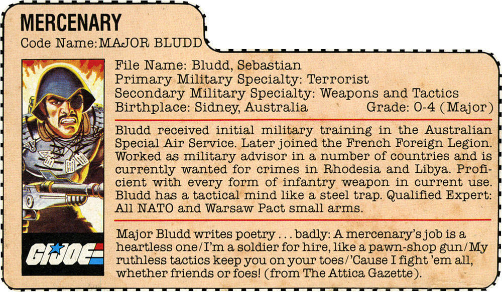Major Bludd is listed as “Terrorist” for his PMS and “Weapons and Tactics” for his SMS. It states he got initial training while serving in the Australian Special Air Service (equivalent to the British SAS and USA Delta Force). Later he joined the French Foreign Legion. SO the question remains did he start out in the ASAS as an officer, or as enlisted and maybe worked his way to an officer? Or did he go to the FFL as enlisted and worked his way up to an officer or was already an officer?