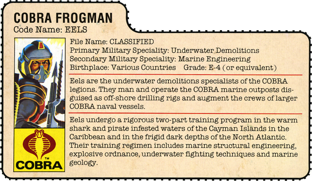 Cobra Polar Assault specialists, the Snow-Serpents, are listed as “Arctic Operations” as their PMS and “Infantry” as their SMS. Their filecard indicates they are Cobra Eels but with additional training that include cold weather training, use of snow shoes, skis and kayaks and airborne training. If Cobra Eels are the equivalent of US Navy SEALS then I would liken Snow Serpents to SEAL Team 2, which its members are more focused on cold weather training. However SEAL Team 2 (as all other SEAL Teams) do not just focus on one area of the environment or method of insertion, but rather are also Airborne-qualified and fight in every environment. I picture the Snow Serpents as still being combat-diver qualified and also engaging in missions that are not just “arctic” or “cold weather”. To me this is a huge waste of an elite unit. Snow Serpent’s would also fight in other environments and be able to insert into a missions via water (combat diving), air (parachuting), helicopter, etc.