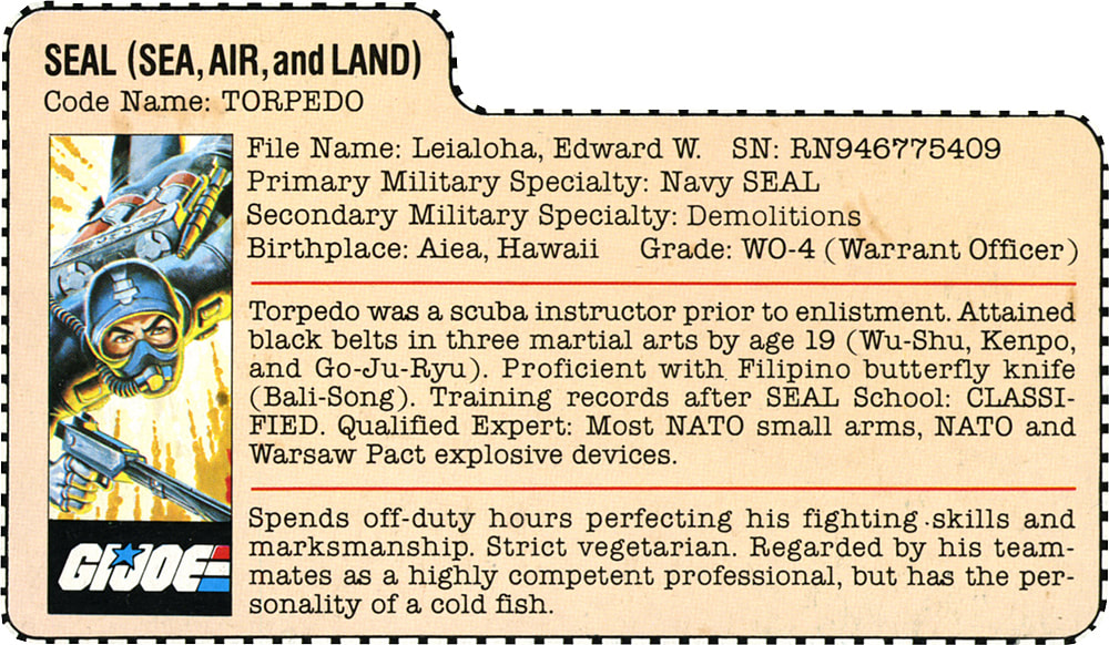 One thing that has bothered me on his filecard is the rank of WO-4. To become a Navy warrant officer one typically has to serve roughly 10 years to even try out for a warrant officer. Then maybe looking at another 10 years to achieve the rank of WO-4. Torpedo would be around 38-39 and while I do like to think the Joes are between the ages of 26-42 I do not know if a SEAL that high up in rank would still be kicking it out i the field and may be more of a desk jockey at that point in their career. Later filecards had Torpedo as an officer and I actually prefer that rank over the WO-4 one on his OG filecard. He could have enlisted as a Torpedoman’s Mate then went to the US Navy Officer Candidate School and then to BUDS. I like to think of him leading the rest of the Joe team’s SEALS.