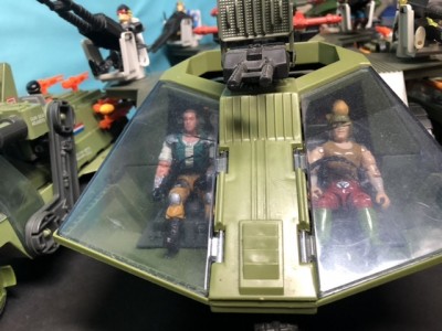 Welcome to the Outpost. Today I’m taking a look at the 1988 G.I.Joe Rolling Thunder. What a remarkable vehicle this one is. There are a ton of cool features on this vehicle and this thing has bad ass written all over it. I’ll start with the front. There are 2 separate canopies for the driver and the copilot. The back has a huge turret that seats 2 and there are 4 individual seats with guns.