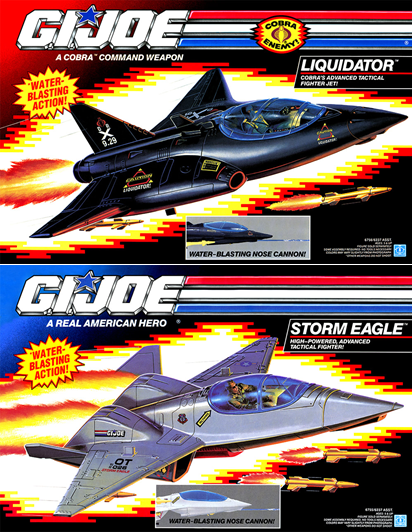 The 1992 Cobra Liquidator and the G.I.Joe Storm Eagle. Both of these look like pretty cool realistic jets. The cool feature about these 2 is they both turn into water guns. The 2 I have still work good but even dry they have a handle that drops down so you can hold it like a gun. This feature is cool and I can see the creative thought process that went into these 2 jets. 2 kids could have hours of fun chasing each other around with or without water. I like the look of them and they display well. Thanks for checking in stay safe out there. Do you have the G.I.Joe Liquidator or Storm Eagle in your collection? Sound off and share your thoughts on these collectibles AFTER THE JUMP!