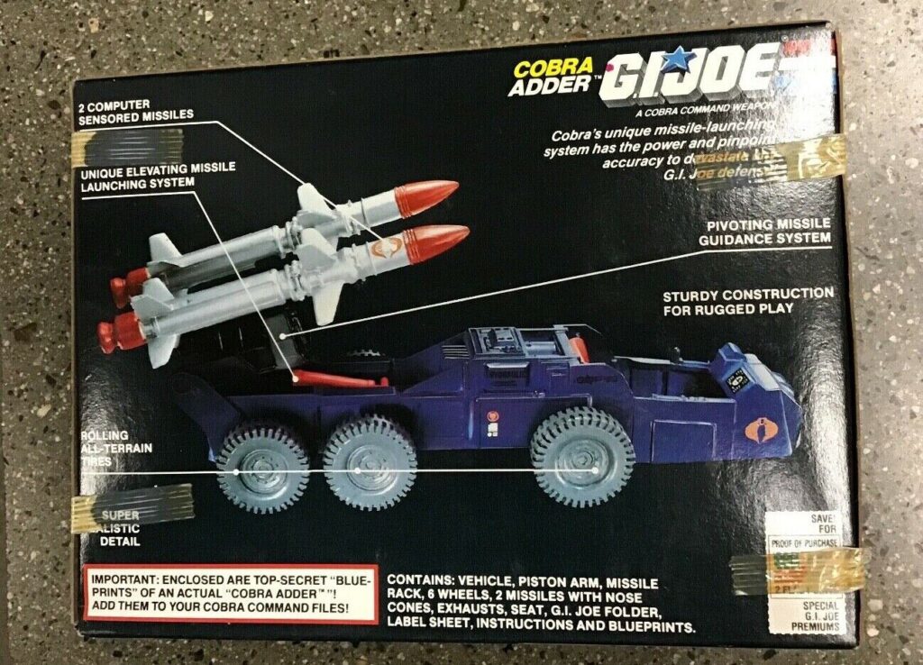 Welcome to the Outpost. Today I’m checking out a G.I. Joe vehicle from 1988, the Cobra Adder. I never hear much about this vehicle. I always thought it was a cool vehicle. You may need a few of these as it carries 2 missiles and after that you’re heading home. Maybe there should have been some smaller side missiles or a front gun, but either way this vehicle has a cool look and is really solid all around.