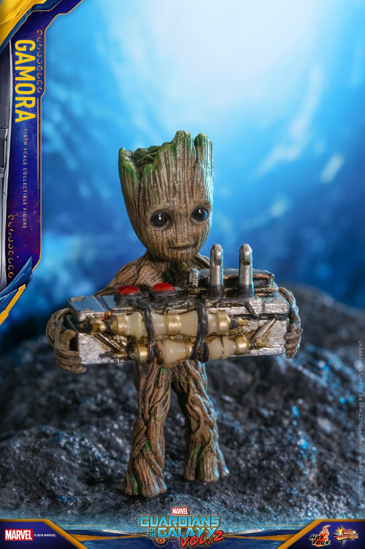 The new Gamora 1/6th scale collectible figure is expertly crafted based on the image of Zoe Saldana as Gamora in the film. The figure features a newly developed head sculpt with long curly black and purplish-red real fabric hair, a finely detailed costume including a meticulously tailored leather-like coat based on her latest appearance in the MCU, a sword, a folded up sword, and a selection of accessories unique to Guardians of the Galaxy Vol. 2 including a blaster, an interchangeable long sleeve tee, an Aero Rigs armored with chest plate, a miniature Baby Groot holding a bomb and a movie-theme figure stand!