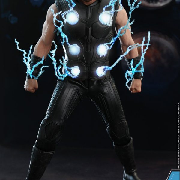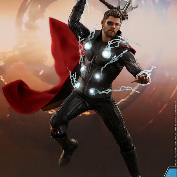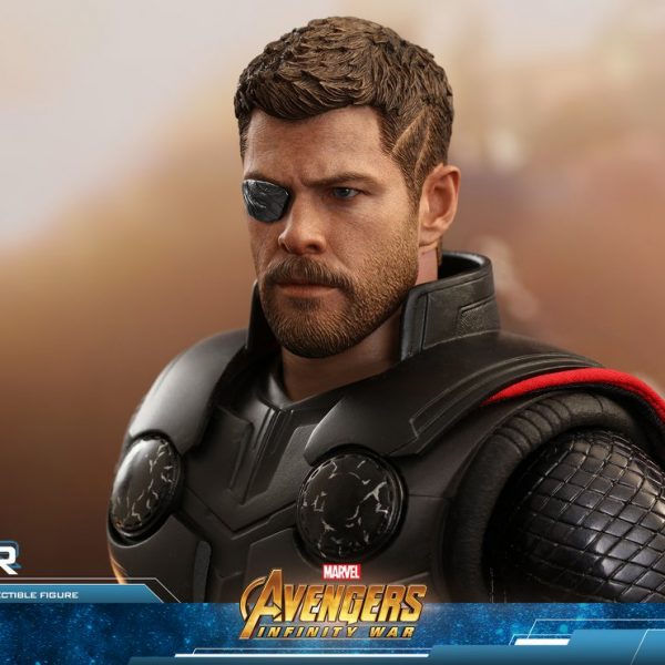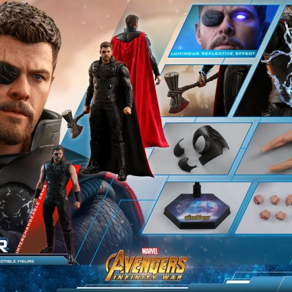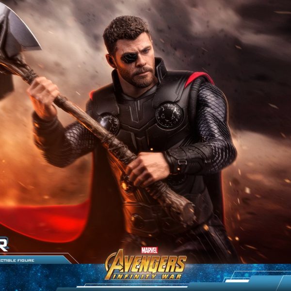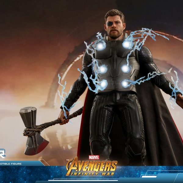 Hot Toys has released new photos and details for their upcoming Avengers: Infinity War Thor 1/6 Scale Figure! Thor includes a luminous reflective effect for his one good eye, lightning effects pieces, light up circle plates in the chest, swap out armored and bare arms, interchangeable hands, the new Stormbreaker weapon, a detachable cape, and a figure stand.