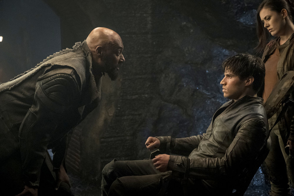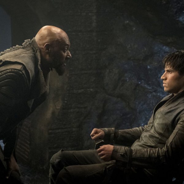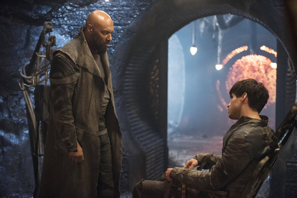 KRYPTON — “House of Zod” Episode 105 — Pictured: (l-r) Colin Salmon as Black Zero Operative, Cameron Cuffe as Seg-El — (Photo by: Steffan Hill/Syfy)