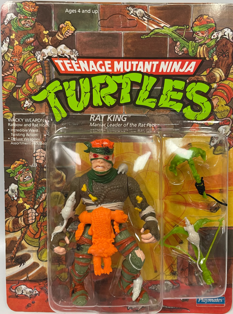 When the Rat King action figure arrived in 1989, he stood apart from the neon chaos of the TMNT roster. Wrapped in filthy bandages, stitched clothing, and tangled straps that looked scavenged from corpses, Rat King felt less like a toy and more like something you weren’t supposed to touch. His sculpt suggested disease, survival, and isolation—a creature who lived where sunlight died. Kids didn’t need backstory; one look told you everything. This was someone you’d rather not meet in a dark tunnel.