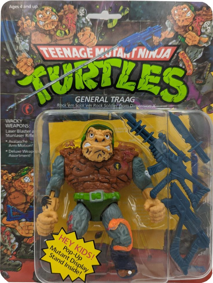 The General Traag action figure, released in 1989, was a masterpiece of sculpting. With his rough-hewn stone texture, jagged armor, and heavy blaster rifle, he looked ripped straight out of a rocky wasteland. His figure had a weight to it — visually if not literally — that made him feel like a boss battle in physical form. Kids immediately recognized him as a powerhouse, the kind of villain you needed all four Turtles to fight at once. He didn’t just stand on the shelf; he dominated it.
