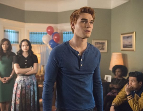 Riverdale — “Chapter Thirty-Five: Brave New World” — Image Number: RVD222b_0192.jpg — Pictured (L-R): Robin Givens as Sierra McCoy, Camila Mendes as Veronica, KJ Apa as Archie, Ashleigh Murray as Josie and Charles Melton as Reggie — Photo: Dean Buscher/The CW — é 2018 The CW Network, LLC. All rights reserved.