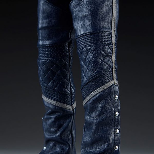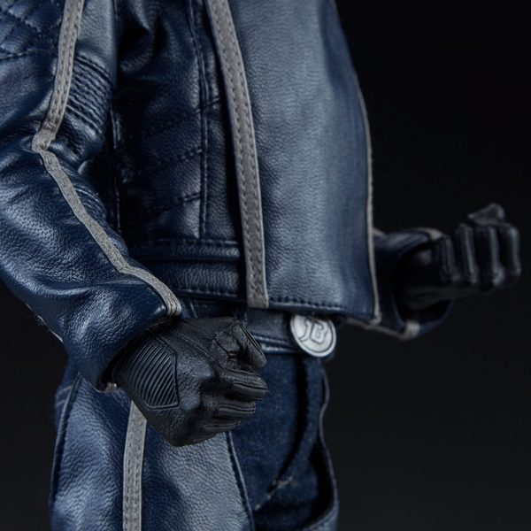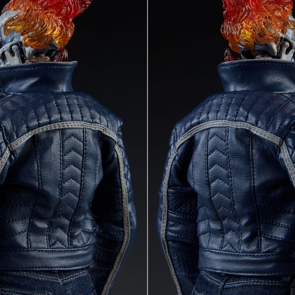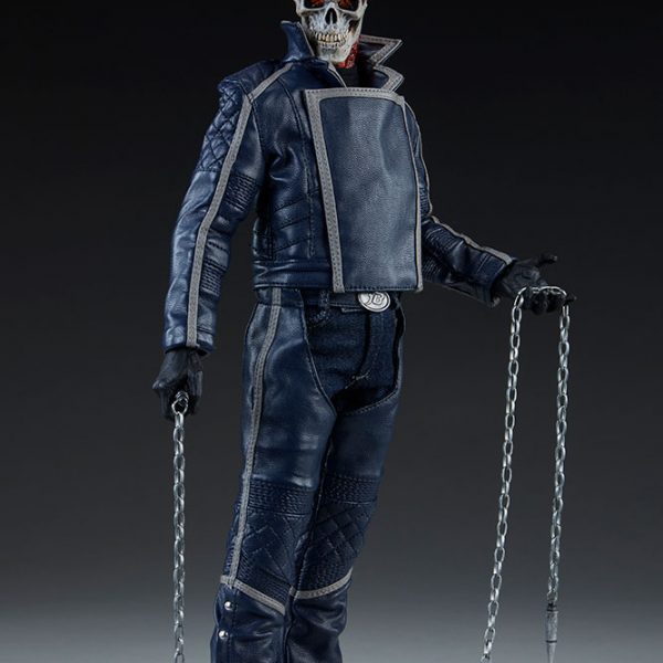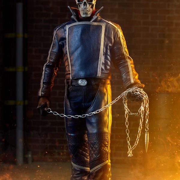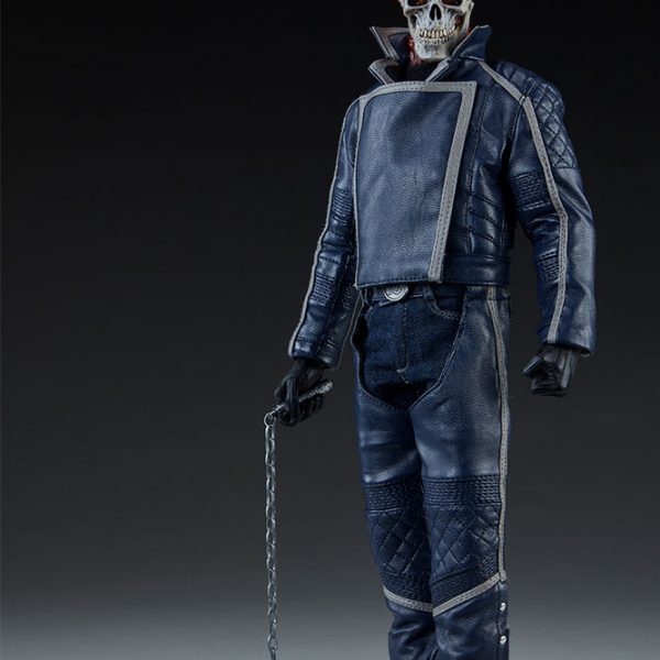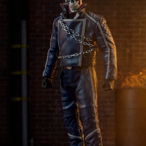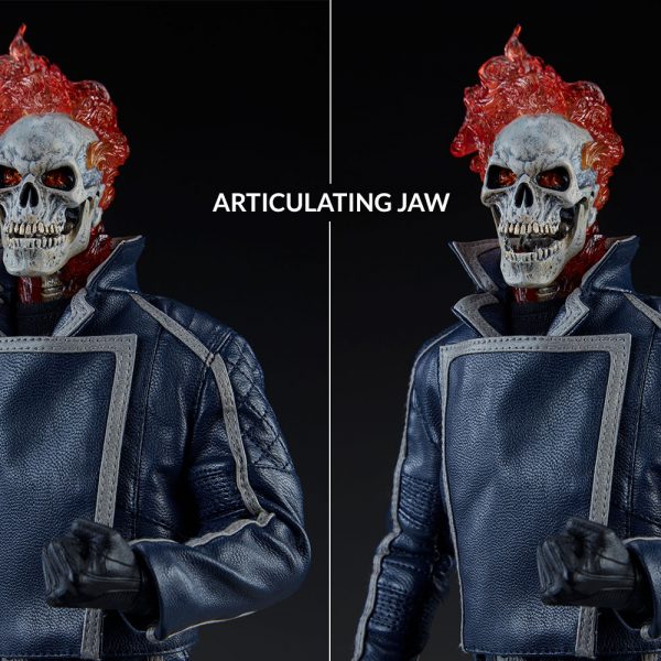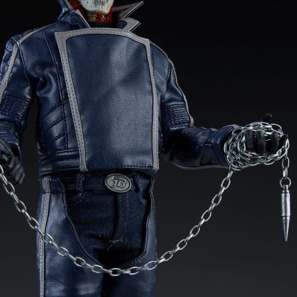 The Ghost Rider Classic Sixth Scale Figure also features a highly-detailed fabric costume, which includes a blue leather-like jacket with a removable jacket bib, and blue leather-like chaps. His biker costume also features tailored t-shirt and denim jeans, with a “JB” belt buckle. Each piece is stitched with incredible details, capturing the devilish style of this supernatural superhero.