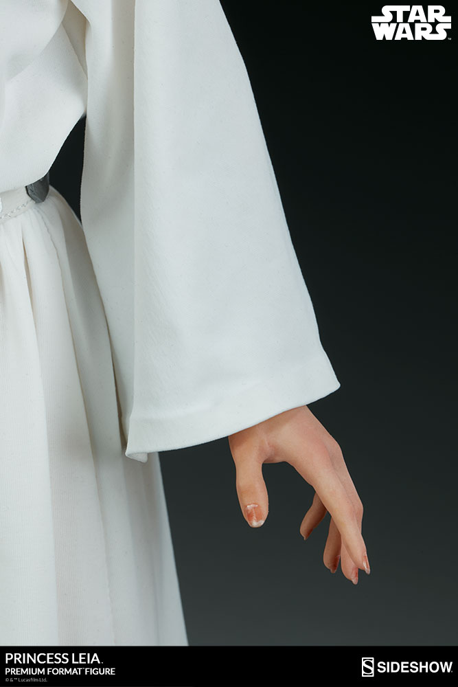 Princess Leia wears a custom tailored fabric costume, carefully styled after her famous white gown with a hood and a silver belt. The figure has a polystone body with sculpted boots, along with a PVC portrait and hands. Down to the sculpture of her fingertips, the Princess Leia Premium Format™ Figure is a tribute to this timeless character who has inspired an entire galaxy of Star Wars fans.