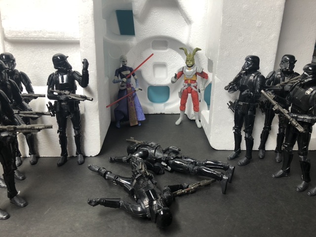 Cool enough to make me pick it up and say to myself ok even after seeing pictures and videos of this figure I was still impressed at the look of the figure and the uniqueness of him. The mold is really nice on this one and the head is really nicely detailed. I put him up against some other 6 inch figures and he looks great with them. He comes with 2 blasters and one hand with a trigger finger and one that wasn’t but I cut the fingers very carefully to have both hands have trigger fingers.
