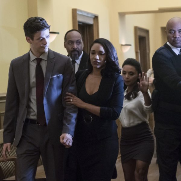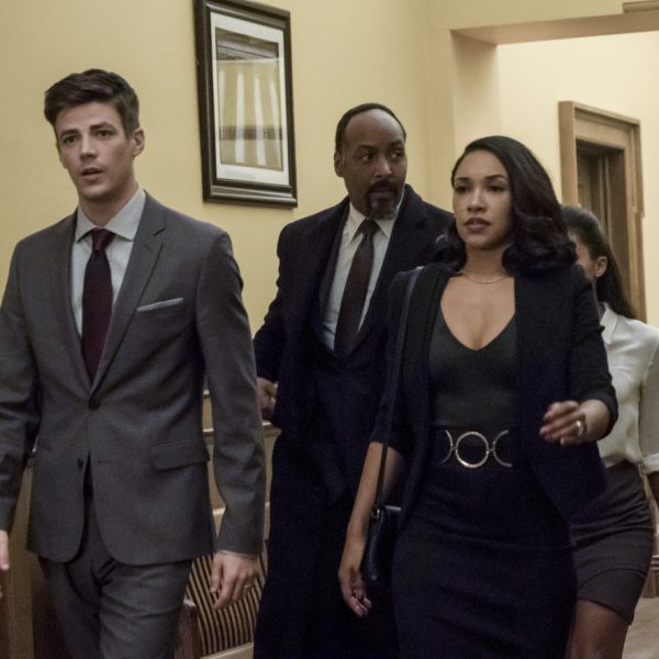 The Flash — “The Trial of The Flash” — Image Number: FLA410b_0146b.jpg — Pictured (L-R): Grant Gustin as Barry Allen, Jesse L. Martin as Detective Joe West, Candice Patton as Iris West and Danielle Nicolet as Cecile Horton — Photo: Katie Yu/The CW — é 2017 The CW Network, LLC. All rights reserved