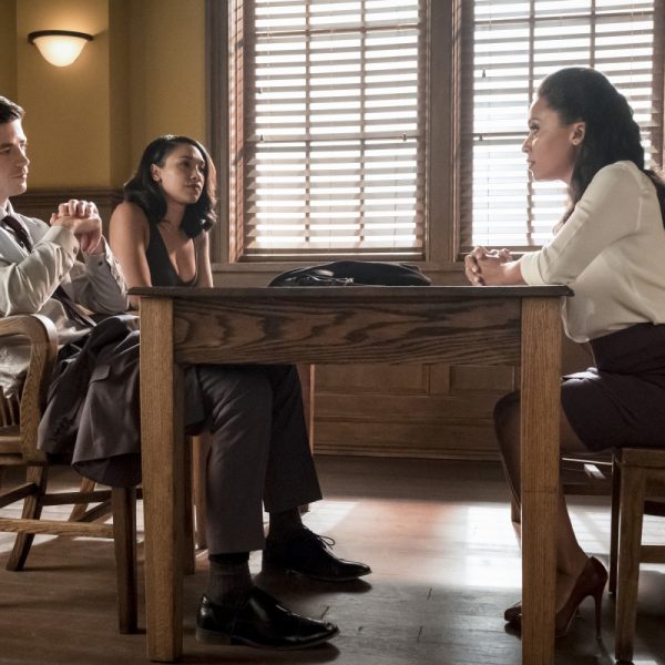 The Flash — “The Trial of The Flash” — Image Number: FLA410b_0166b.jpg — Pictured (L-R): Grant Gustin as Barry Allen, Candice Patton as Iris West and Danielle Nicolet as Cecile Horton — Photo: Katie Yu/The CW — é 2017 The CW Network, LLC. All rights reserved