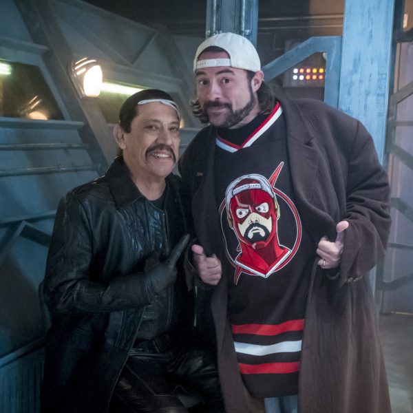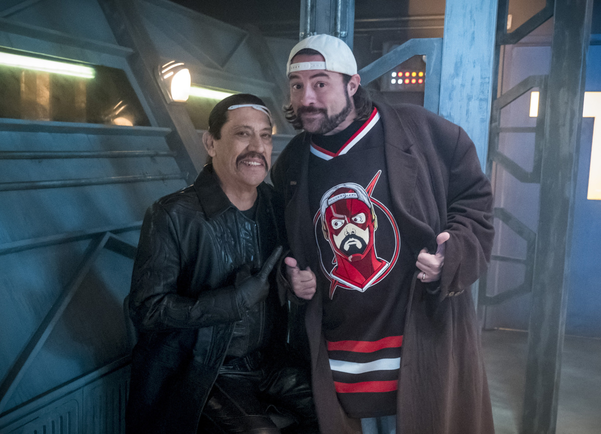 The Flash — “Null and Annoyed” — Image Number: FLA417a_BTS_0356b.jpg — Pictured (L-R): Behind the scenes with Kevin Smith and Danny Trejo — Photo: Katie Yu/The CW — é 2018 The CW Network, LLC. All rights reserved