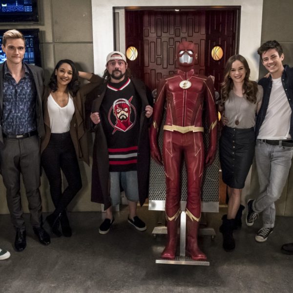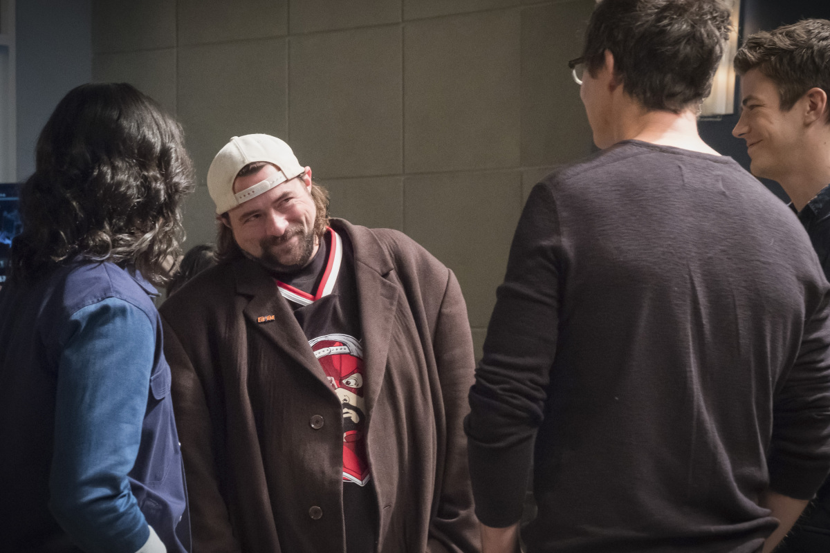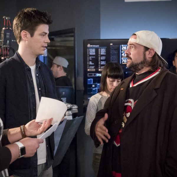 The Flash — “Null and Annoyed” — Image Number: FLA417a_BTS_0385.jpg — Pictured (L-R): Behind the scenes with Grant Gustin and Kevin Smith — Photo: Katie Yu/The CW — é 2018 The CW Network, LLC. All rights reserved