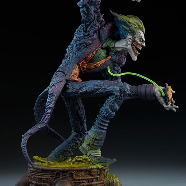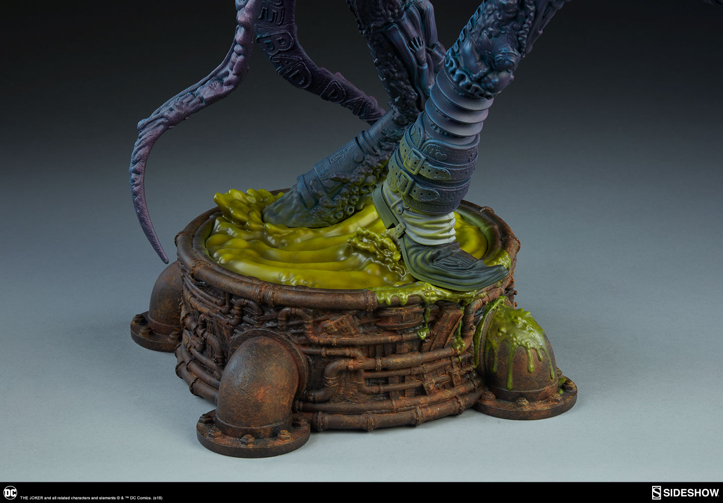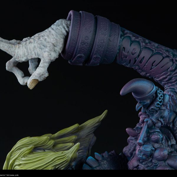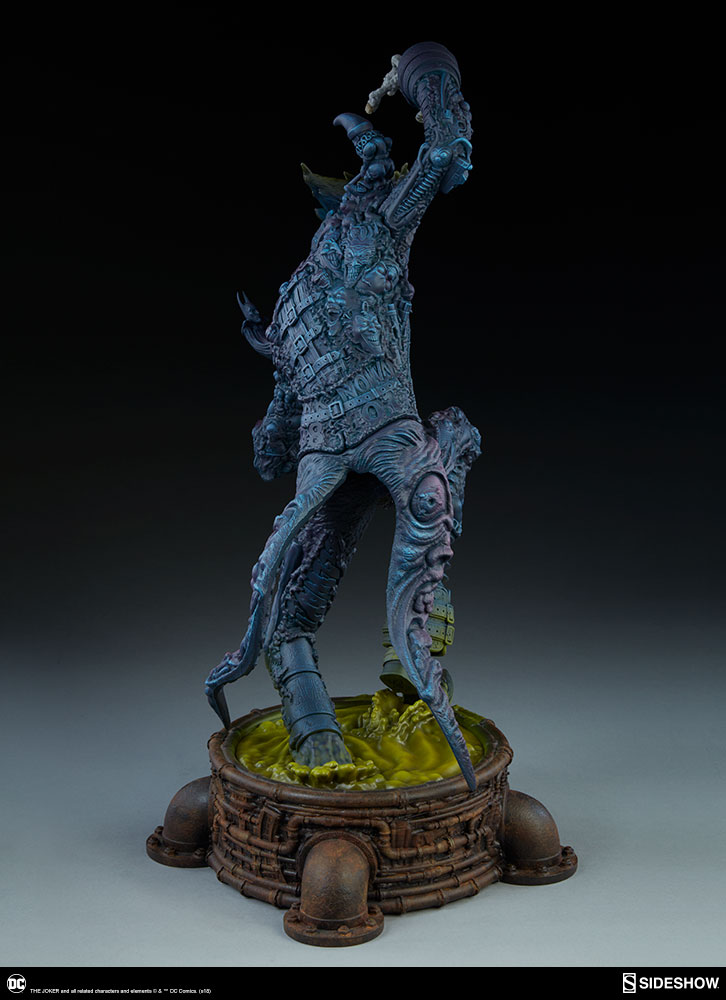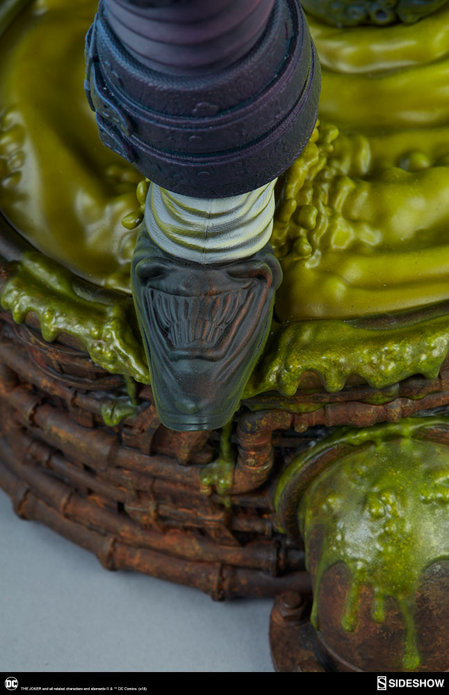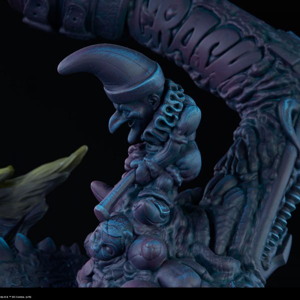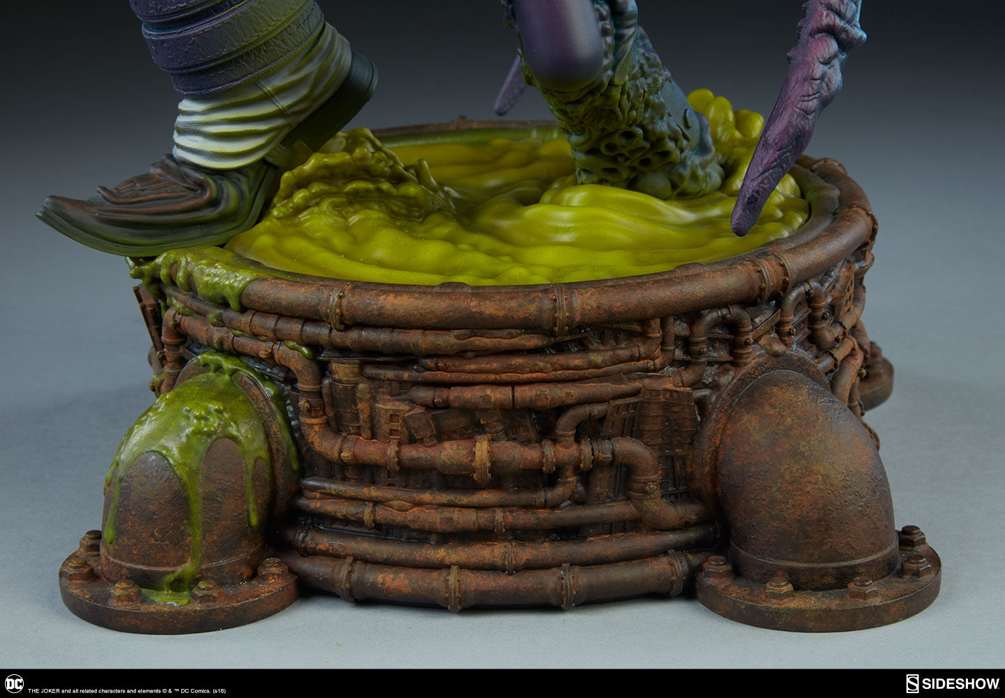 The Joker Statue measures 20” tall, emerging from a chemical vat filled with venomous green acid. Beneath copper-colored pipes, the architecture of Gotham City can be seen laying the groundwork for the rise of this nightmarish Clown Prince of Crime.