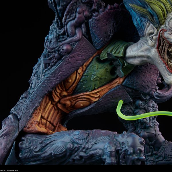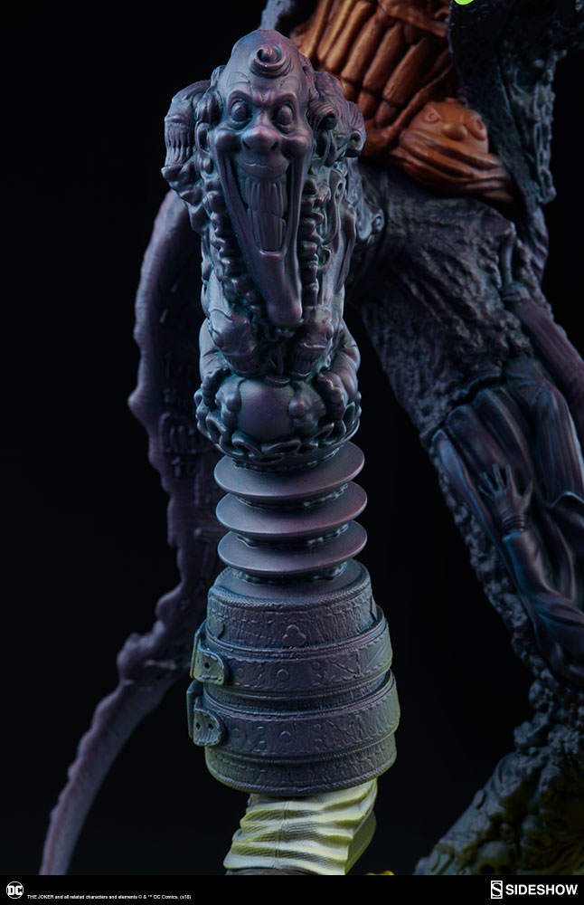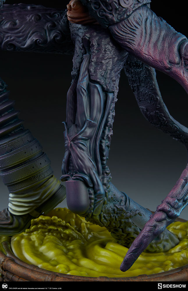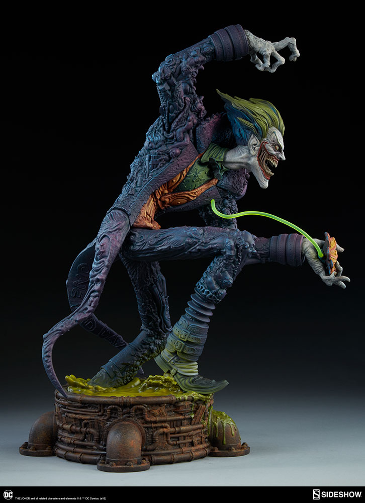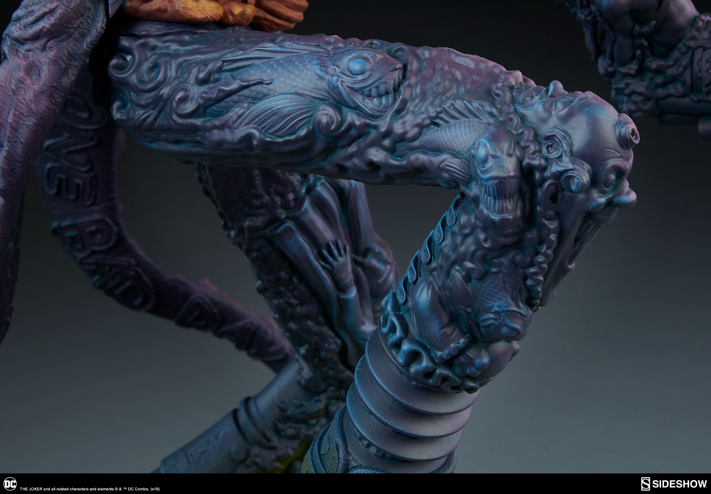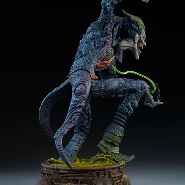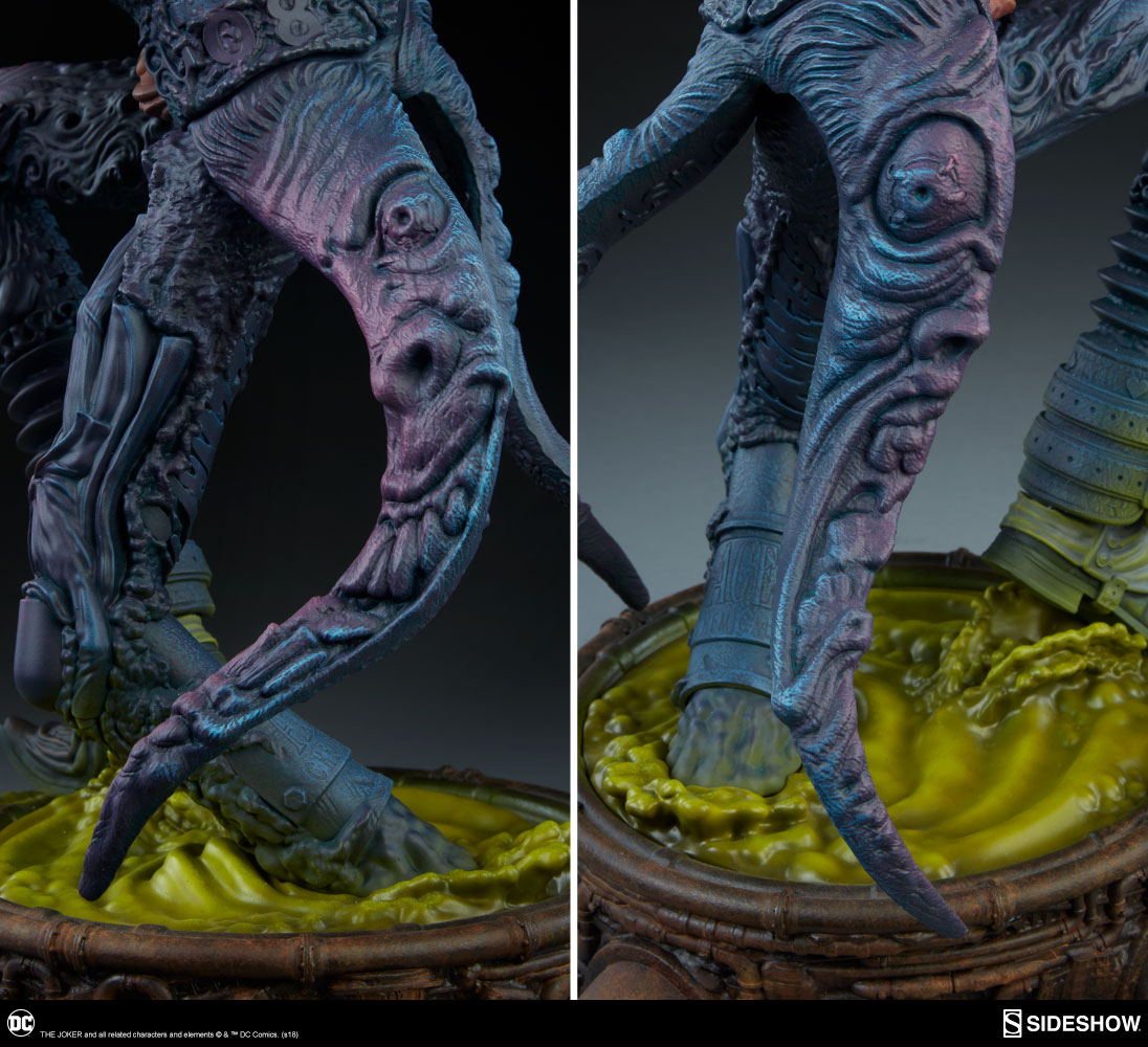 The Joker Statue measures 20” tall, emerging from a chemical vat filled with venomous green acid. Beneath copper-colored pipes, the architecture of Gotham City can be seen laying the groundwork for the rise of this nightmarish Clown Prince of Crime.
