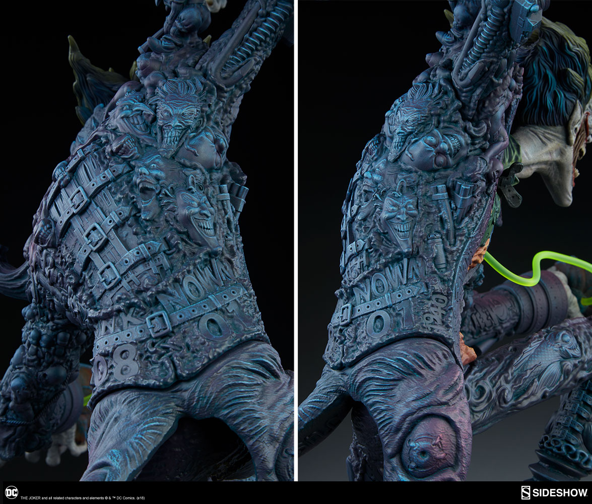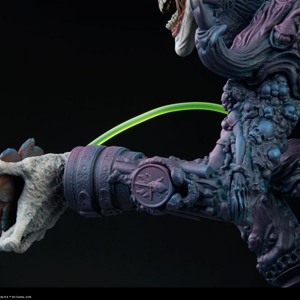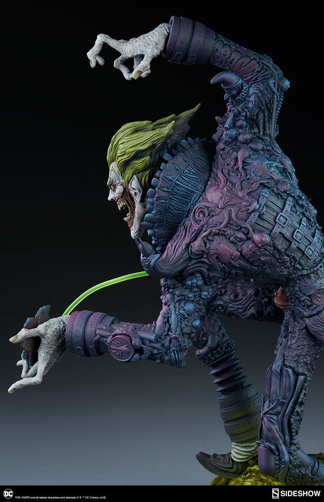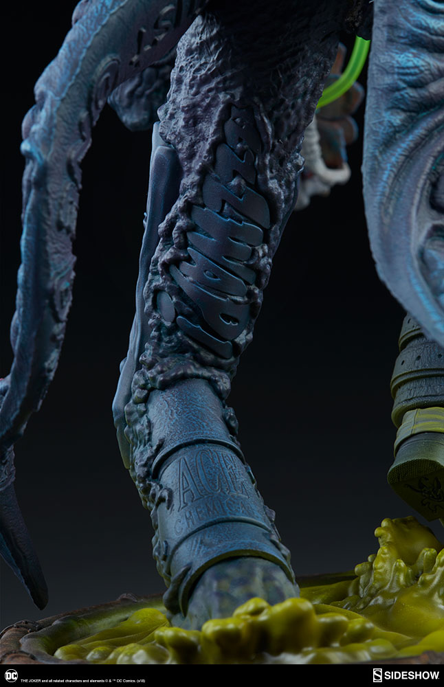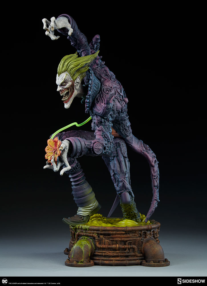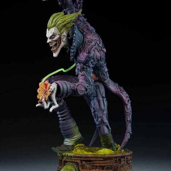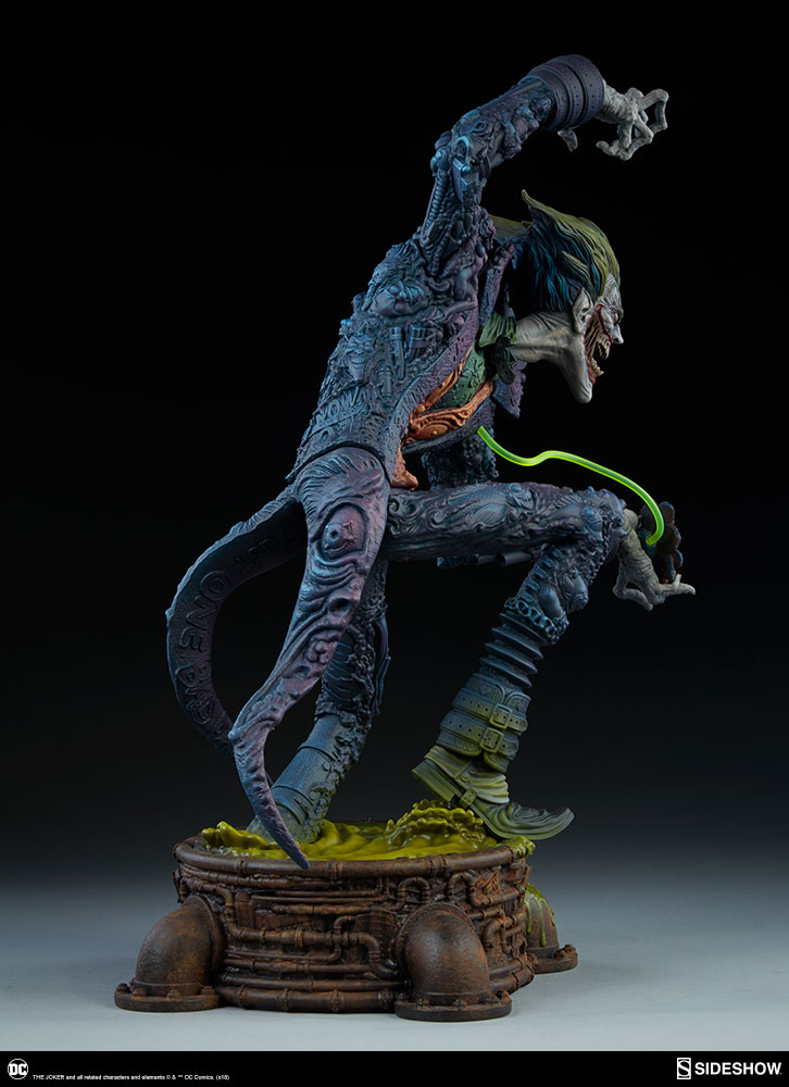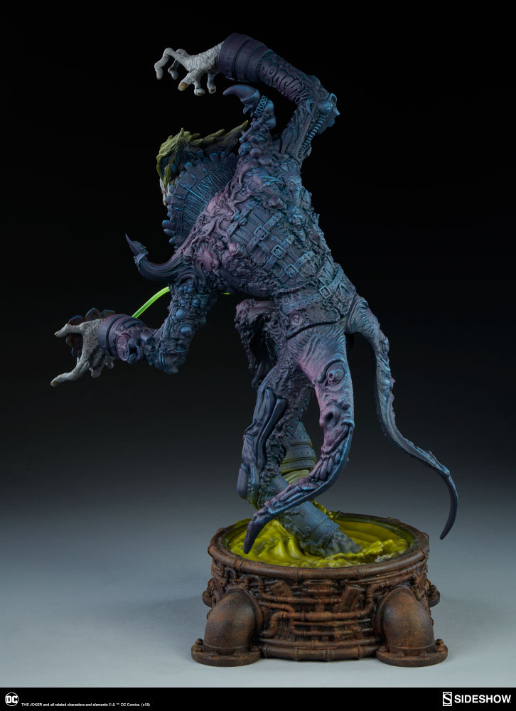 The Joker Statue measures 20” tall, emerging from a chemical vat filled with venomous green acid. Beneath copper-colored pipes, the architecture of Gotham City can be seen laying the groundwork for the rise of this nightmarish Clown Prince of Crime.