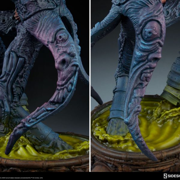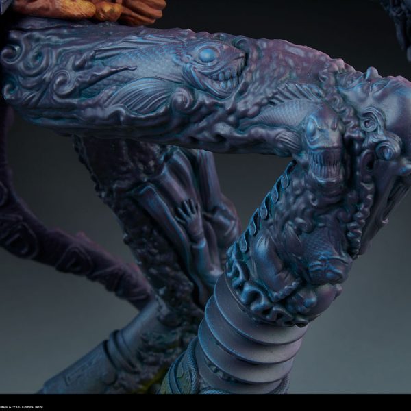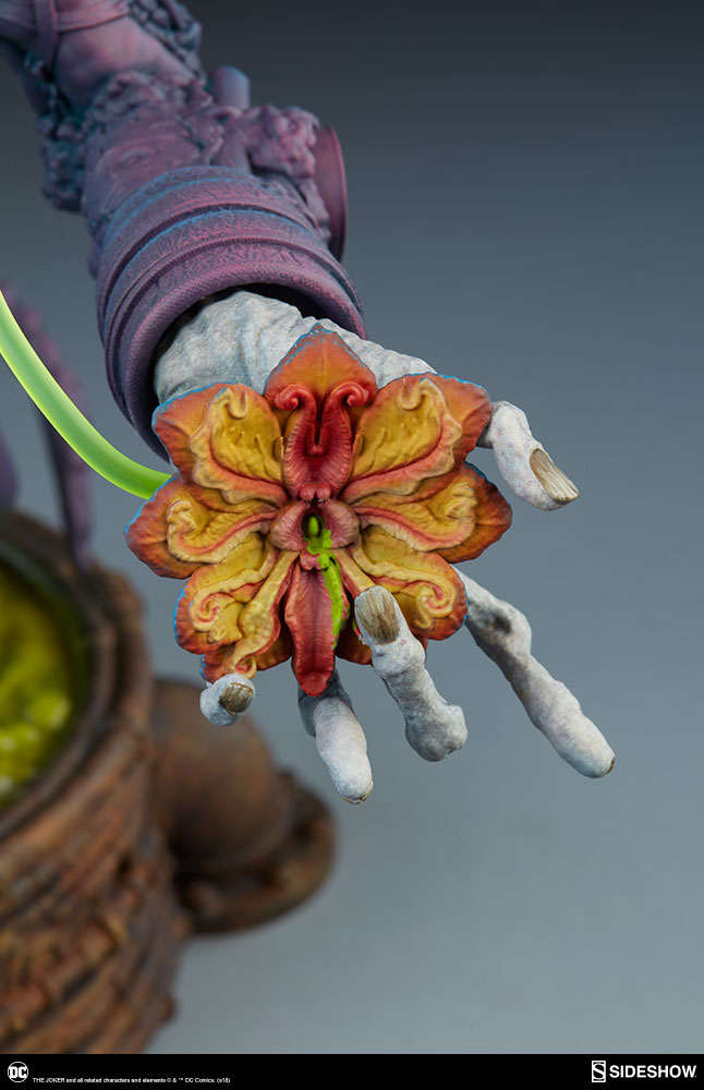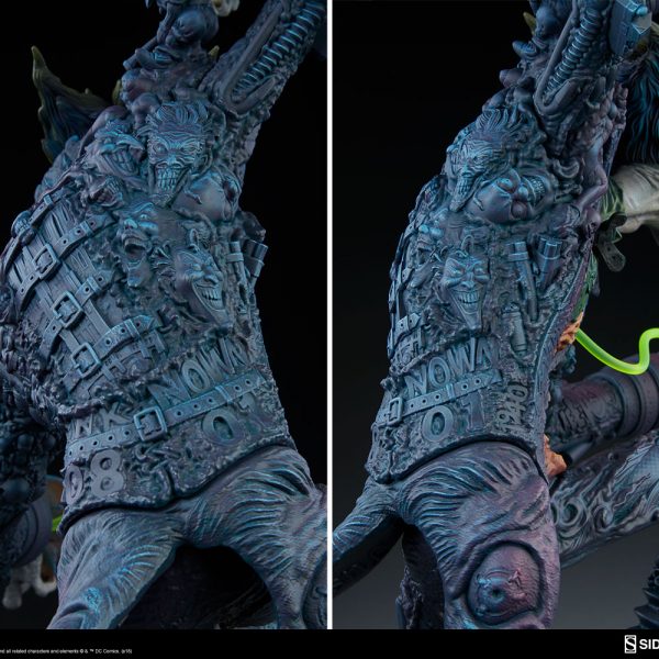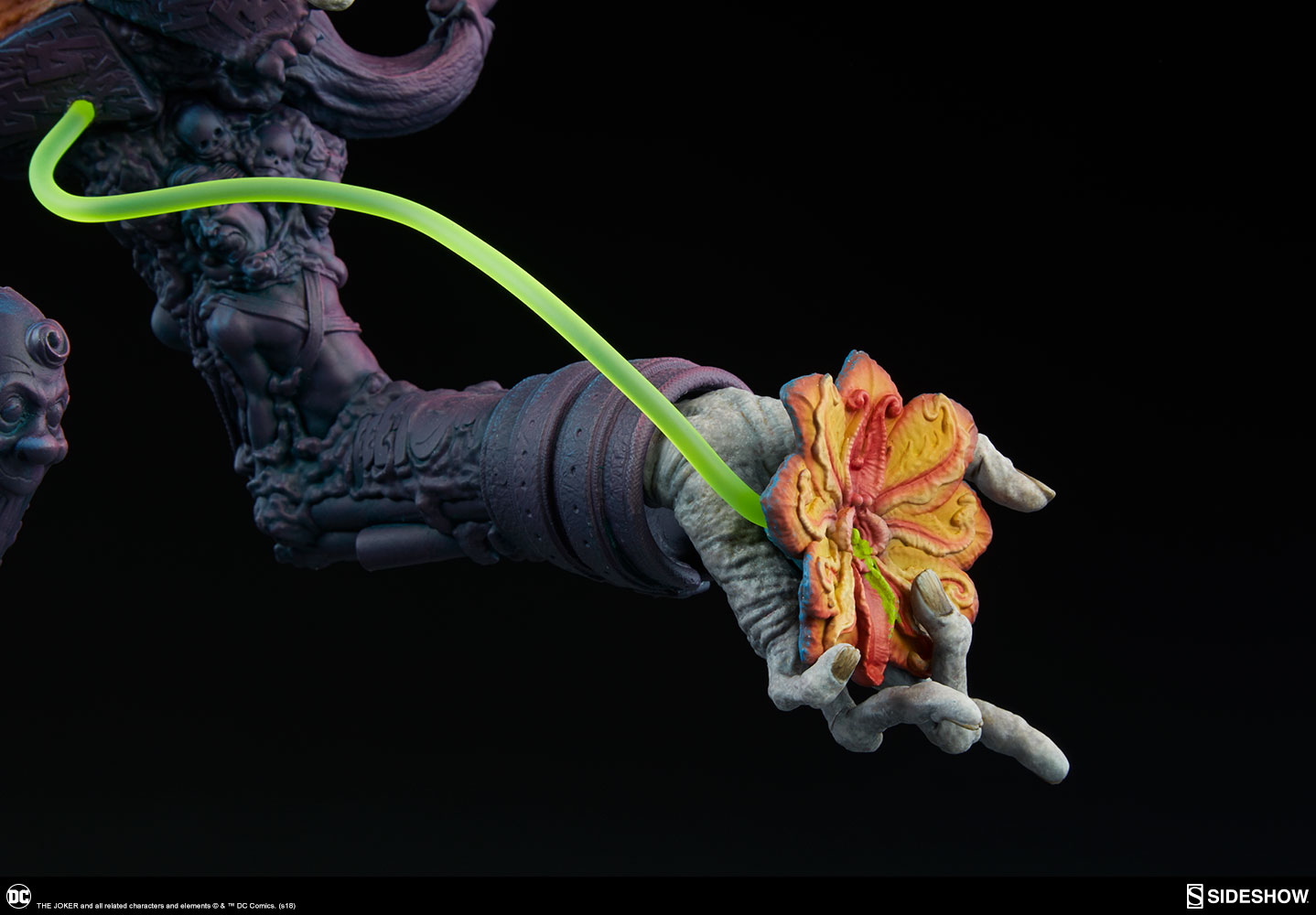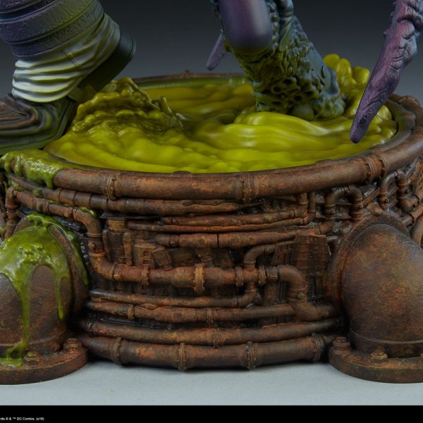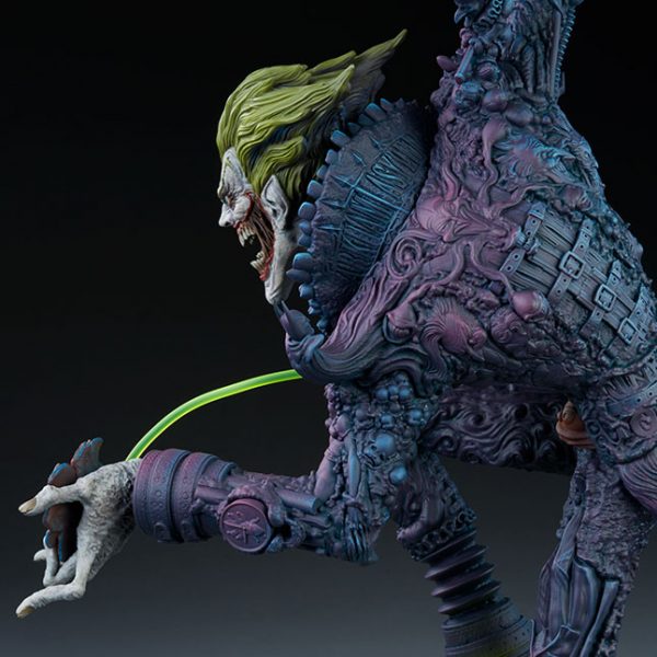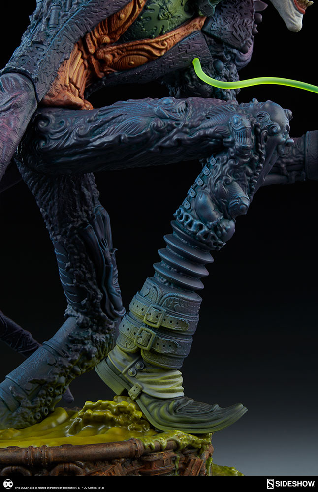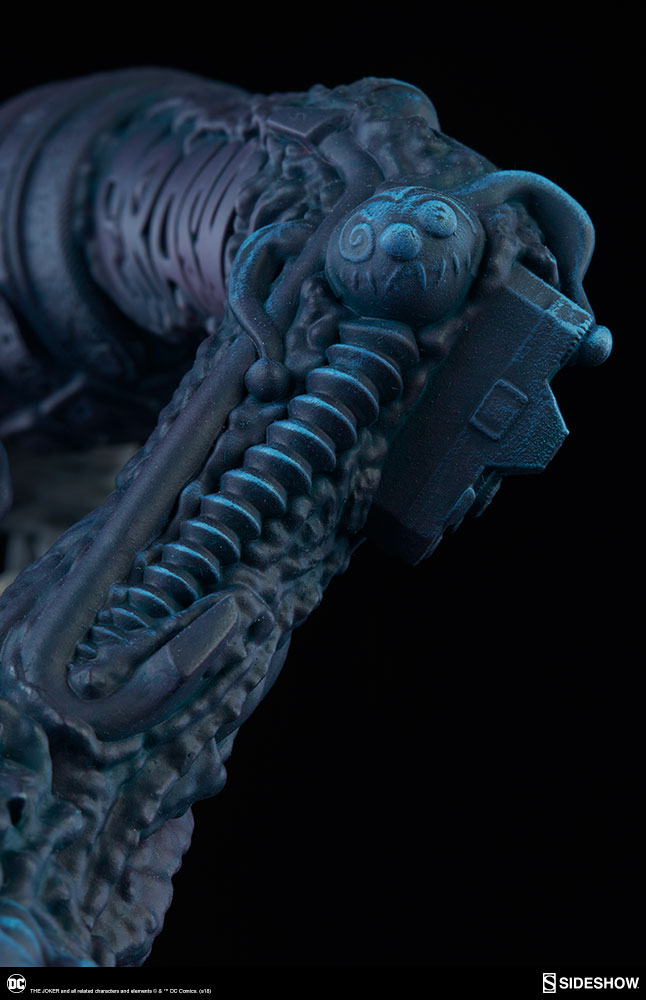 The Joker Statue measures 20” tall, emerging from a chemical vat filled with venomous green acid. Beneath copper-colored pipes, the architecture of Gotham City can be seen laying the groundwork for the rise of this nightmarish Clown Prince of Crime.