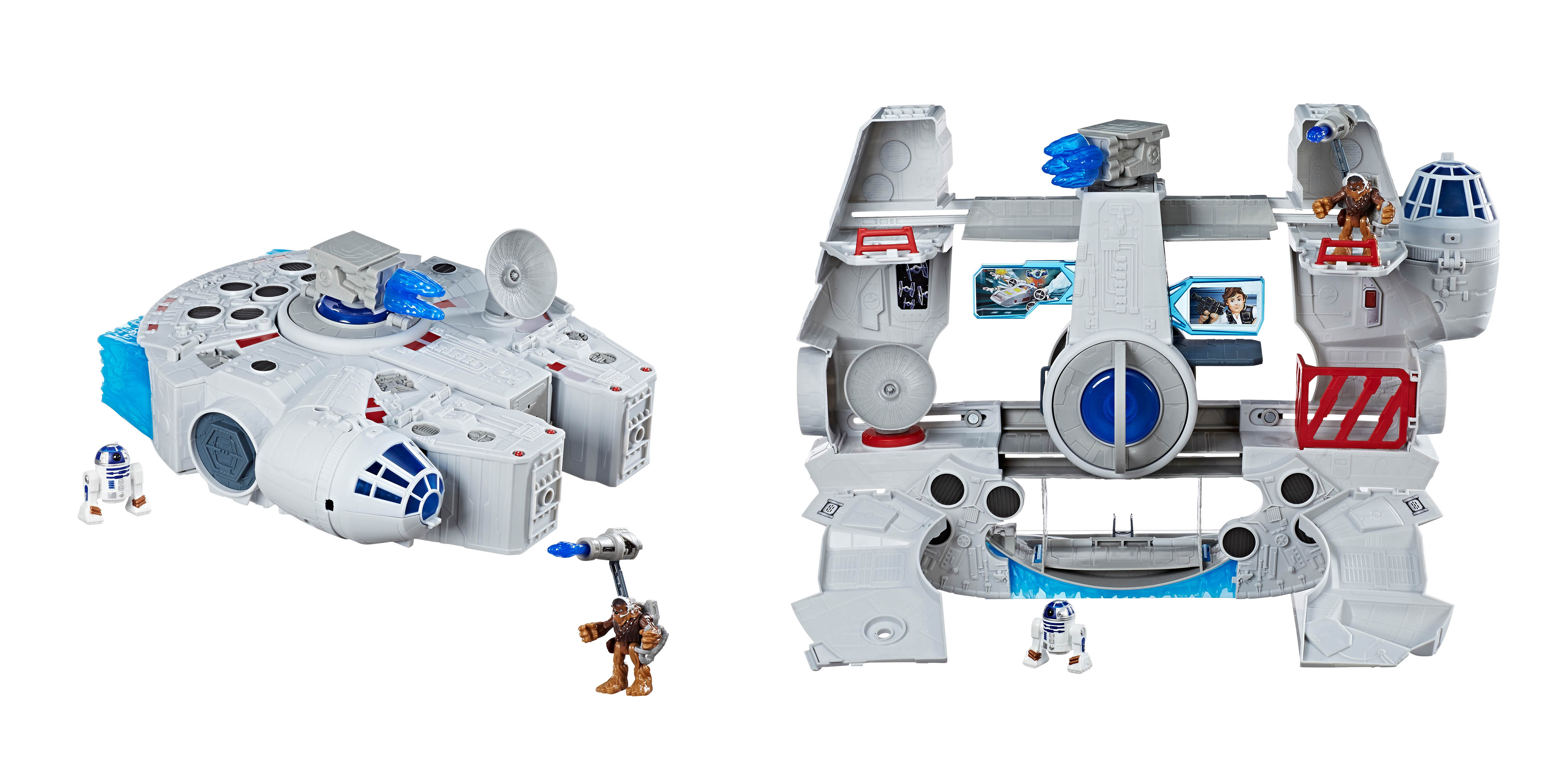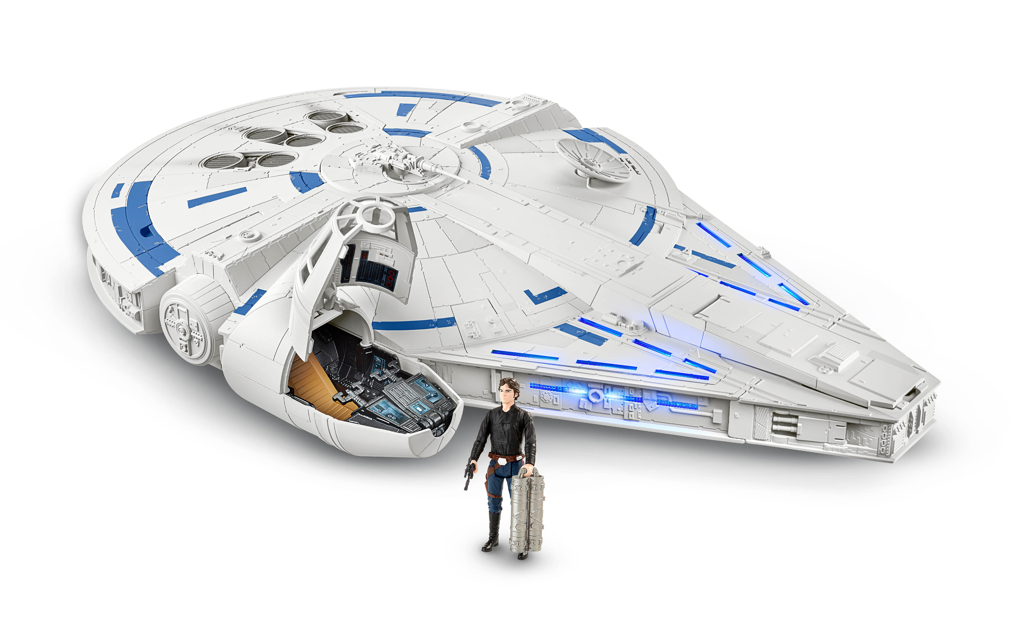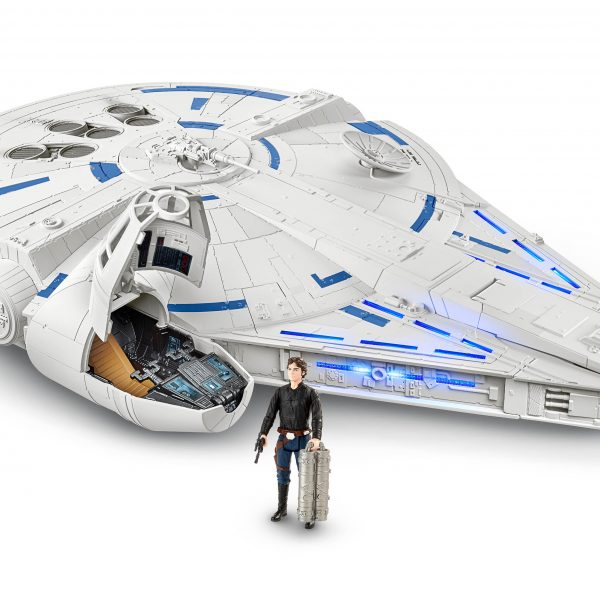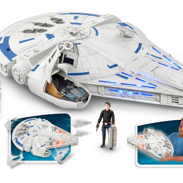 (Ages 4 years & up/Approx. Retail Price: $99.99/Available: Spring 2018) Make the KESSEL RUN in less than 12 parsecs with the MILLENNIUM FALCON! Relive the adventure and imagine flying through every obstacle like ace pilot HAN SOLO with speed and action. Fans will experience flashing lights and sounds as they pretend to race along KESSEL RUN. Press the button to pretend that the iconic starship kicks in to hyperdrive with lights and sounds. Press the button a second time for accelerated lights and sounds as well as activate the rumble pack vibrations! Push the button a third time to pretend that your ship picks up even more speed and watch the panels pop off before rumbling to the finish line! Comes with an exclusive 3.75-inch scale HAN SOLO figure and removable mini ship.