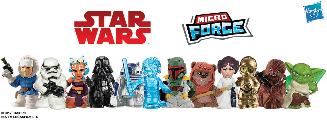 (Ages 4 years & up/Approx. Retail Price: $2.99/Available: Now) Collect the galaxy of fan-favorite characters with the STAR WARS MICRO FORCE Blind Bags Assortment. Each figure has a squishable feel and pose, creating an exciting new way to bring iconic STAR WARS scenes to life! These stylized, movieinspired micro collectibles include iconic characters such as REY, FINN, DARTH VADER, LUKE SKYWALKER, PRINCESS LEIA ORGANA, HAN SOLO, CHEWBACCA, YODA, R2-D2, and more. Each blind bag includes two figures and a collector card. Each sold separately. Available at most major retailers and on HasbroToyShop.com.