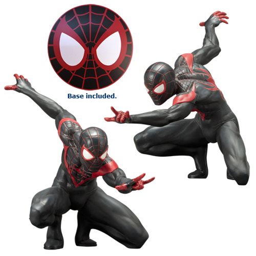 It’s Miles Morales as Ultimate Spider-Man! Spider-Man crouches low, left hand extended to sling a web, right arm back for balance. The web-slinger looks amazing in his black costume with red highlights. This Ultimate Spider-Man 1:10 Scale ArtFX+ Statue measures just over 4-inches tall, is made of plastic with magnetic elements, and comes in window box packaging. Ages 14 and up.