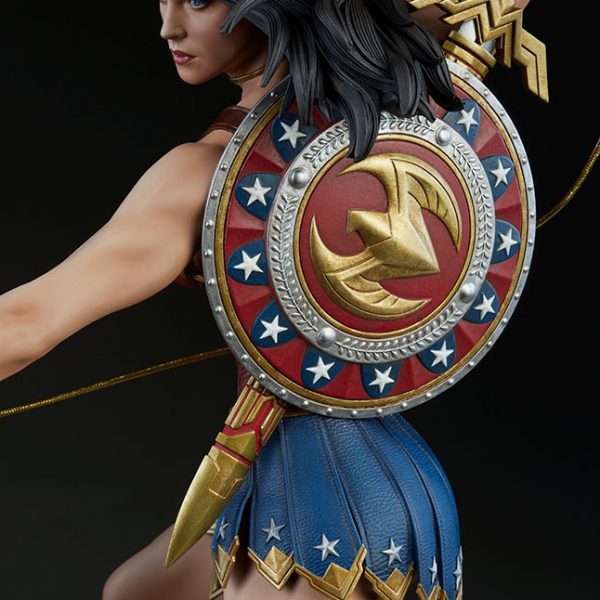 Wonder Woman’s demigoddess physique is carefully sculpted showcasing her grace and strength in polystone. Her iconic red and blue costume is accented with white stars, and her armor includes a golden eagle breastplate, a matching gold belt, silver bracelets, and red boots with silver covers.