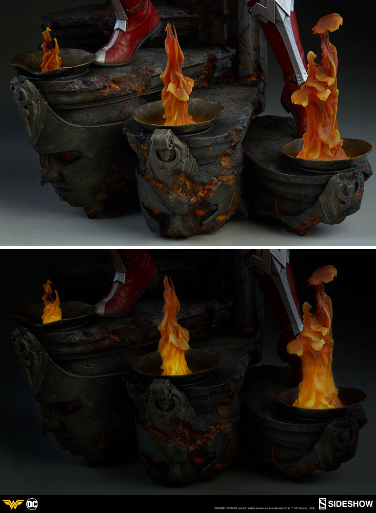 Measuring 22” tall, Wonder Woman stands on guard as she descends a blackened staircase to Hades, lined with clear resin flames that include a flickering light-up feature. The sculpted underworld staircase is detailed with molten orange hues, as well as the shadowy portraits of helmeted warriors, inspired by classical statues.